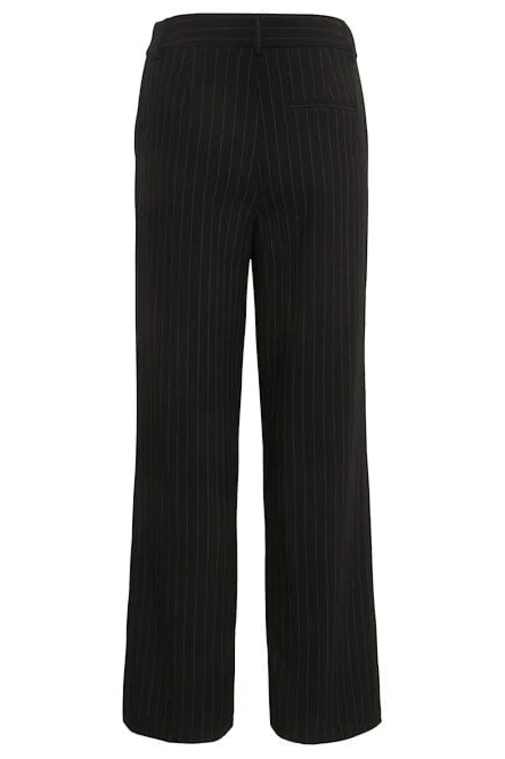 Sorte bukser fra Gestuz med pinstripe-mønster. Bukserne har vide ben og middelhøj talje. De er udstyret med bæltestropper og skrå lommer foran.