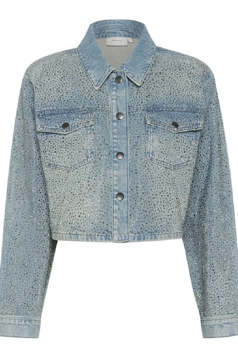 Denimjakke fra Gestuz i en lys blå vask. Jakken har pailletter over det hele, en kort længde og to brystlommer med knapper. Den løse pasform og de lange ærmer giver god bevægelsesfrihed.