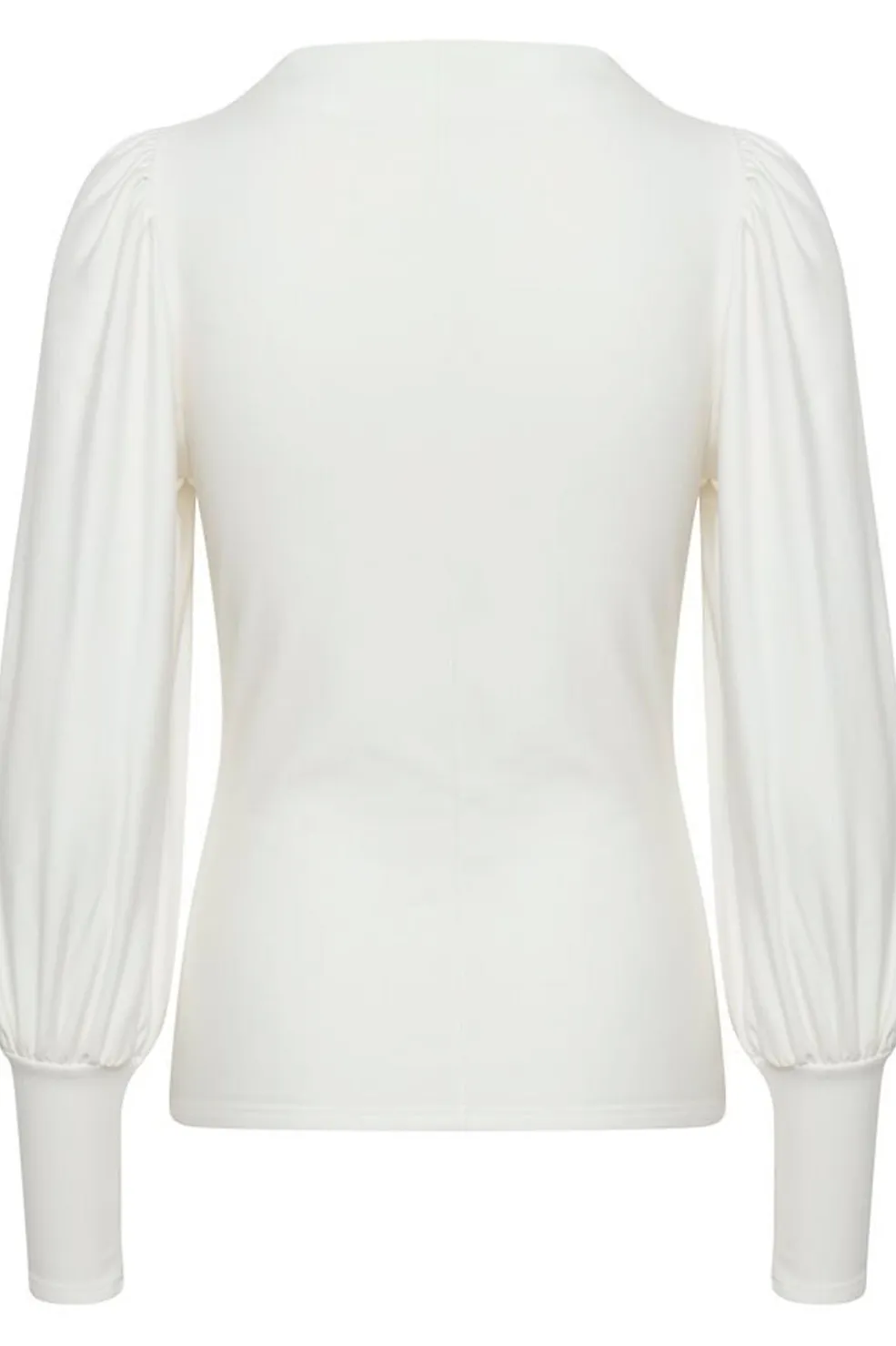 Hvid bluse fra Gestuz med høj hals og rynkedetaljer i siden. De lange ærmer har pufdetaljer, og blusen er lavet i en lys cremefarvet nuance.