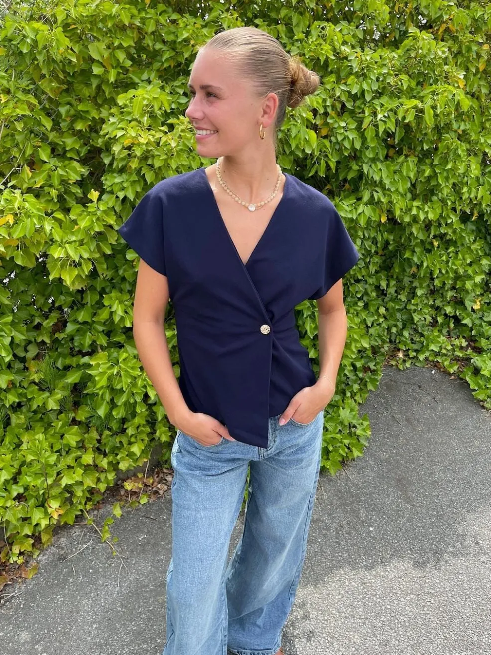 er en kortærmet top med dyb v-udskæring og en asymmetrisk lukning i siden med en enkelt guldknap. Toppen har let markerede skuldre og en figursyet silhuet. Modellen har en str. S på. Obs. lille i str. vi anbefaler derfor at gå én str. op