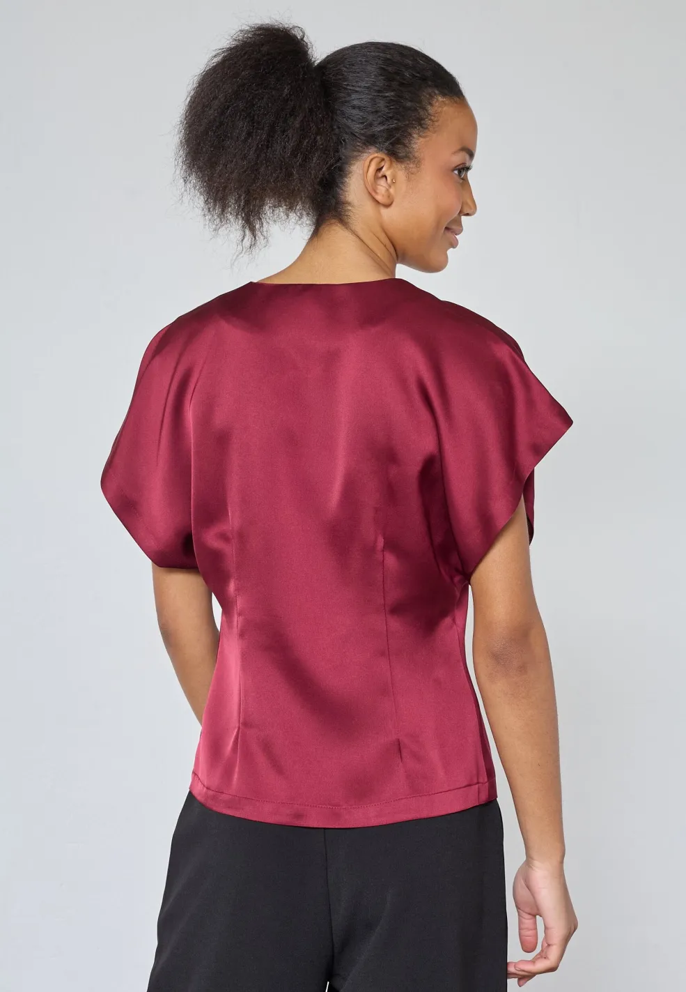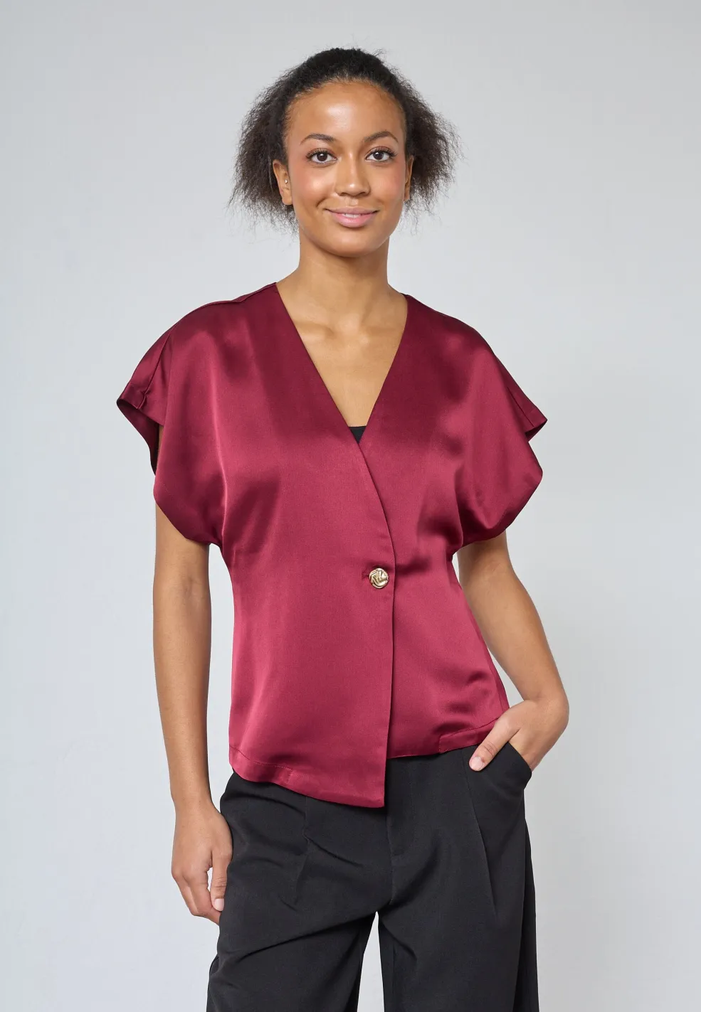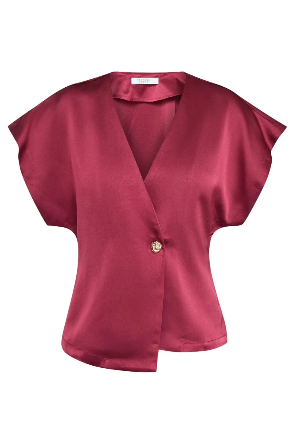 Bluse fra Sisters Point i vinrød. Blusen er lavet af 100 % polyester med en glat og skinnende overflade.