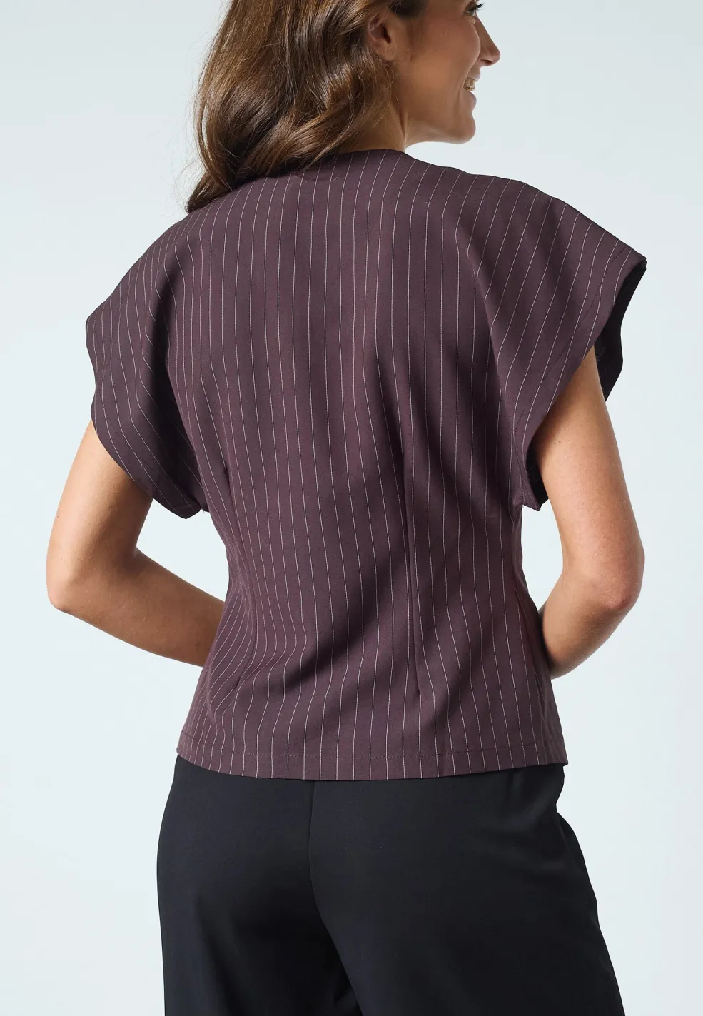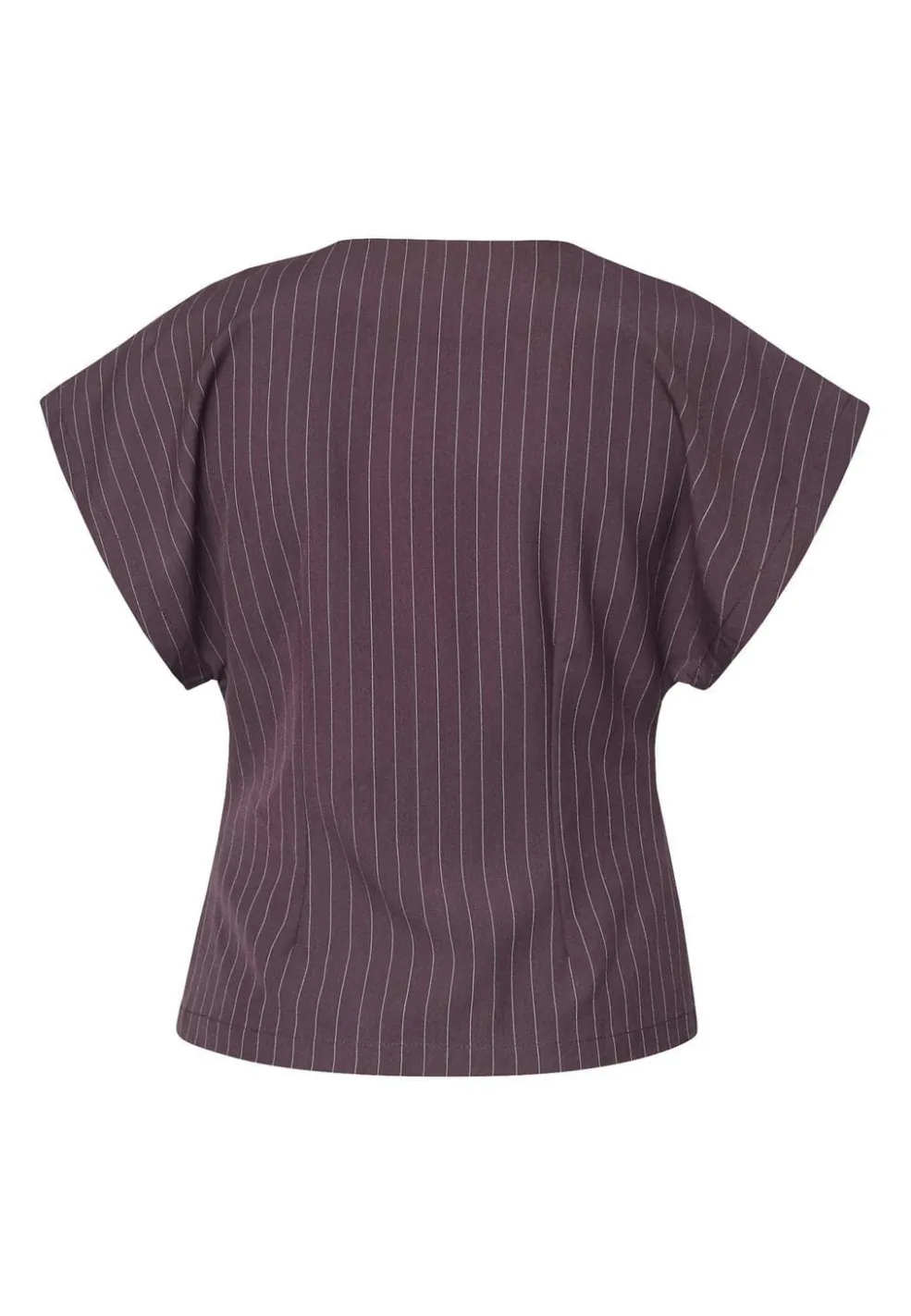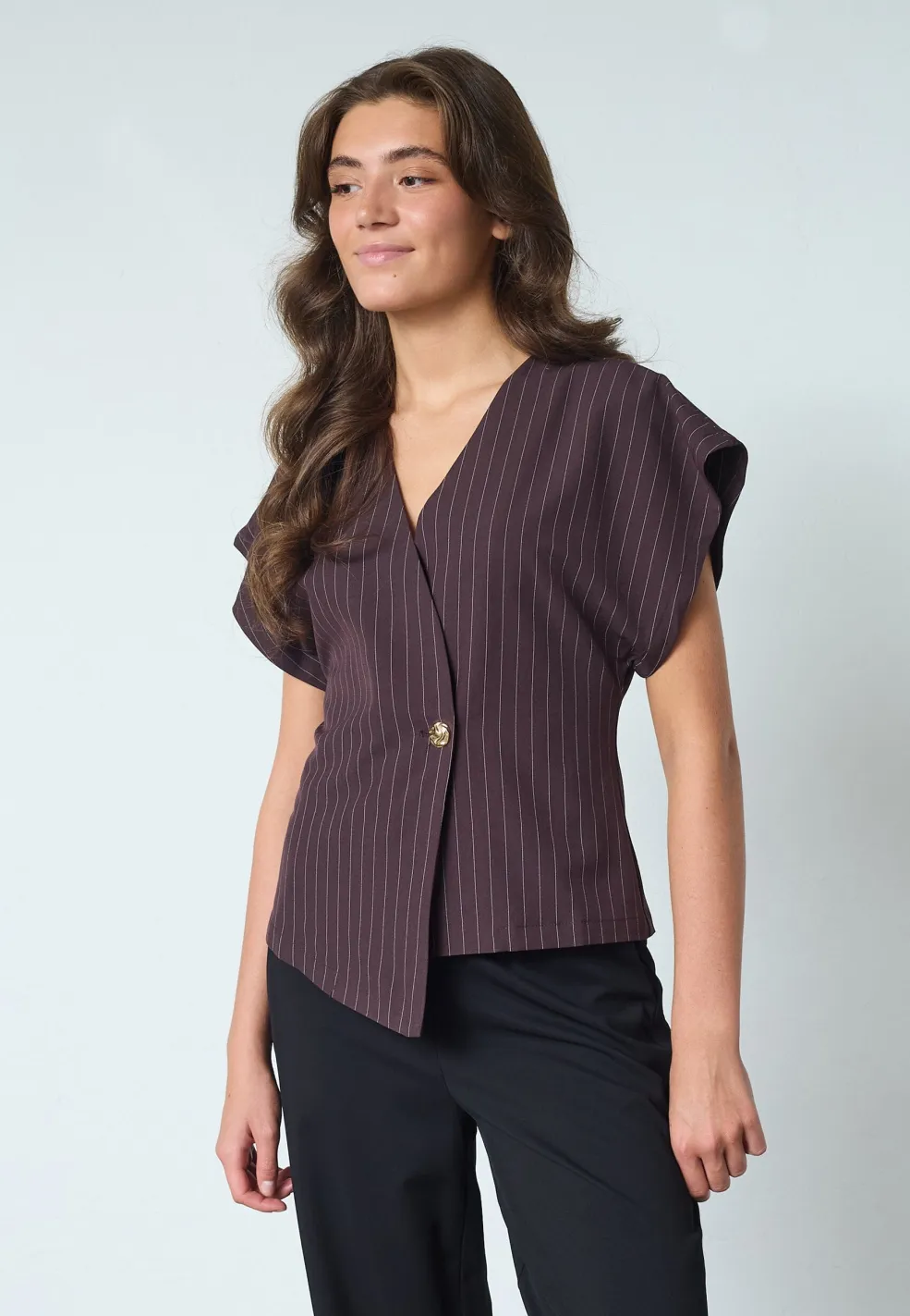 Brunstribet bluse fra Sisters Point med asymmetrisk snit og dyb V-udskæring. Blusen har en enkelt knapdetalje og korte ærmer.