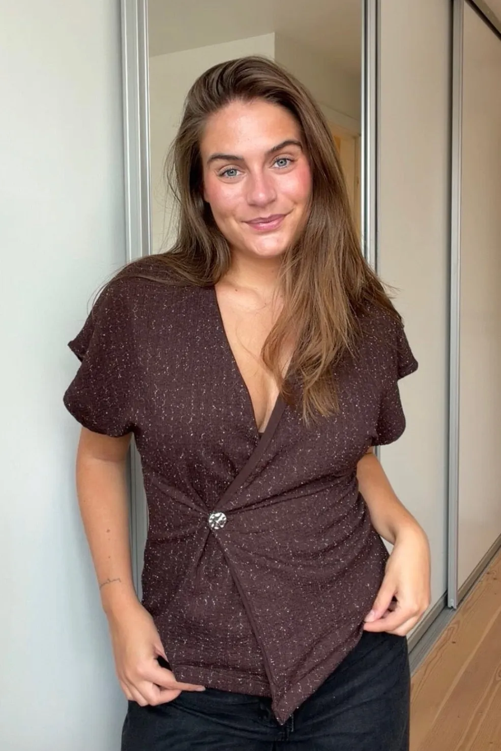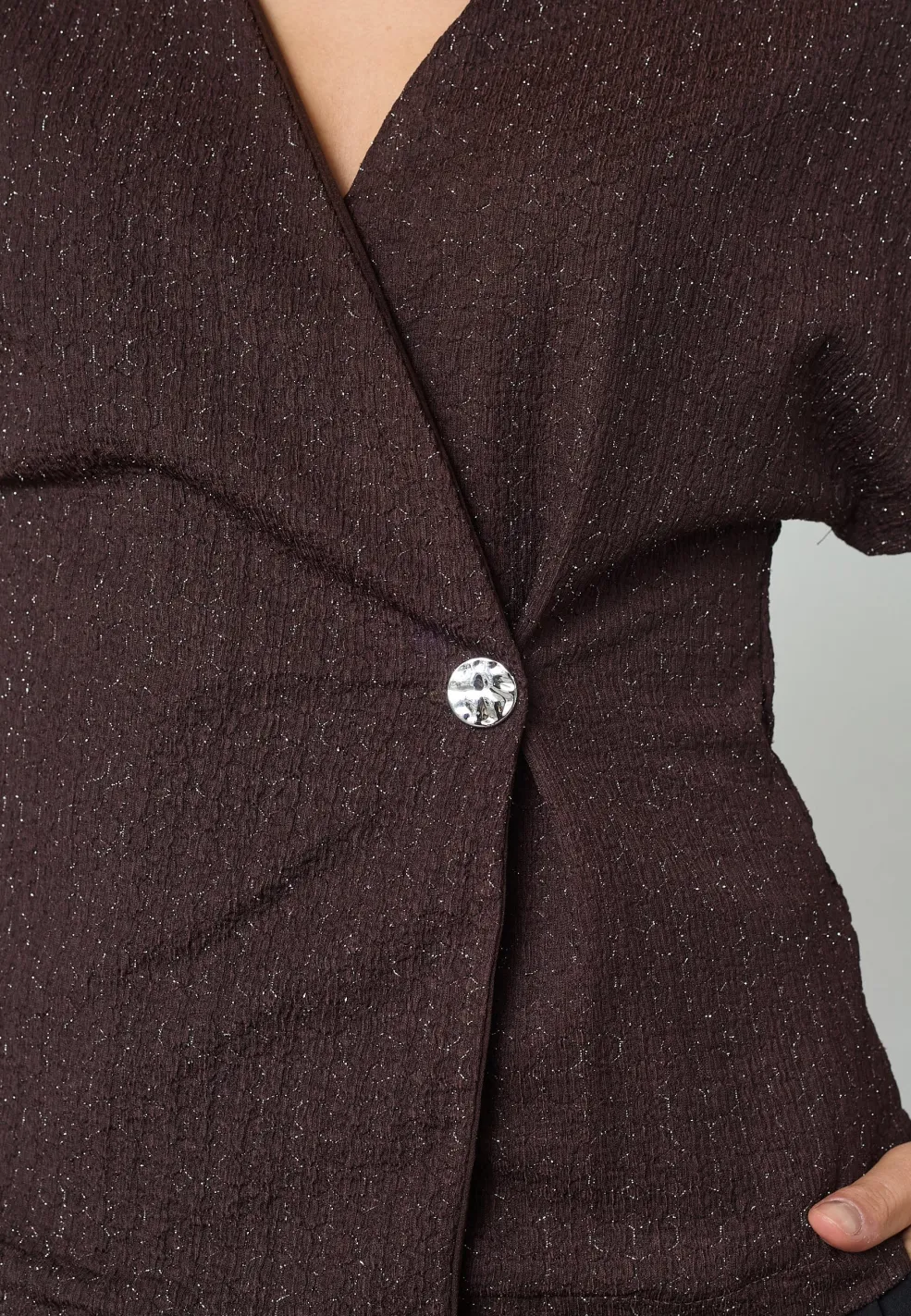 er en elegant vest med et asymmetrisk snit og en v-udskæring. Den har en struktureret overflade. Vesten har brede skuldre og en enkelt knaplukning, der skaber en moderne og unik stil. Modellen har en str. S på.