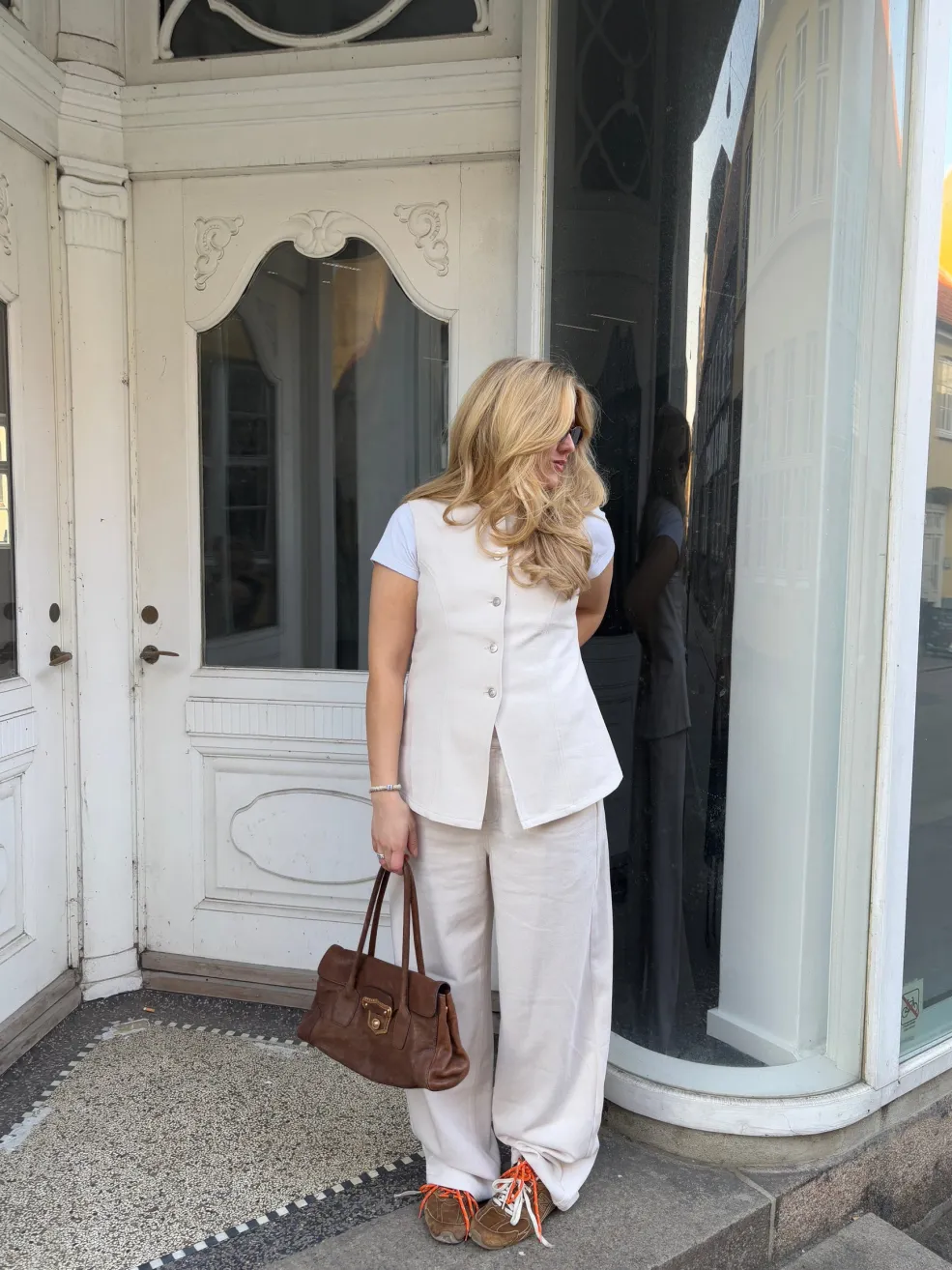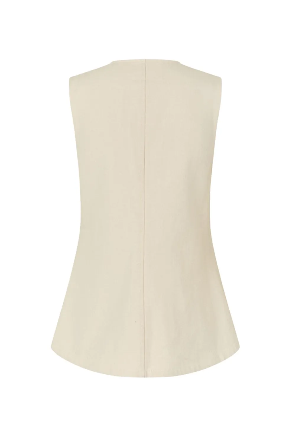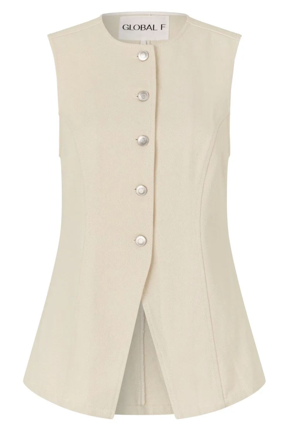 Ærmeløs vest fra Global Funk i en lys ecru-farve. Vesten har en rund hals, knapper foran og dekorative syninger, der giver et rent og enkelt udtryk.