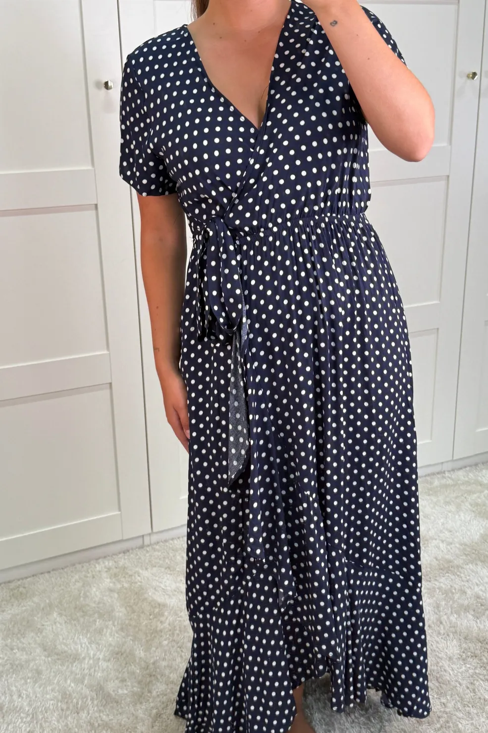 Wrap-kjole fra A-bee i mørkeblå med hvide polkaprikker. Kjolen har korte ærmer, V-hals og når til midt på læggen.