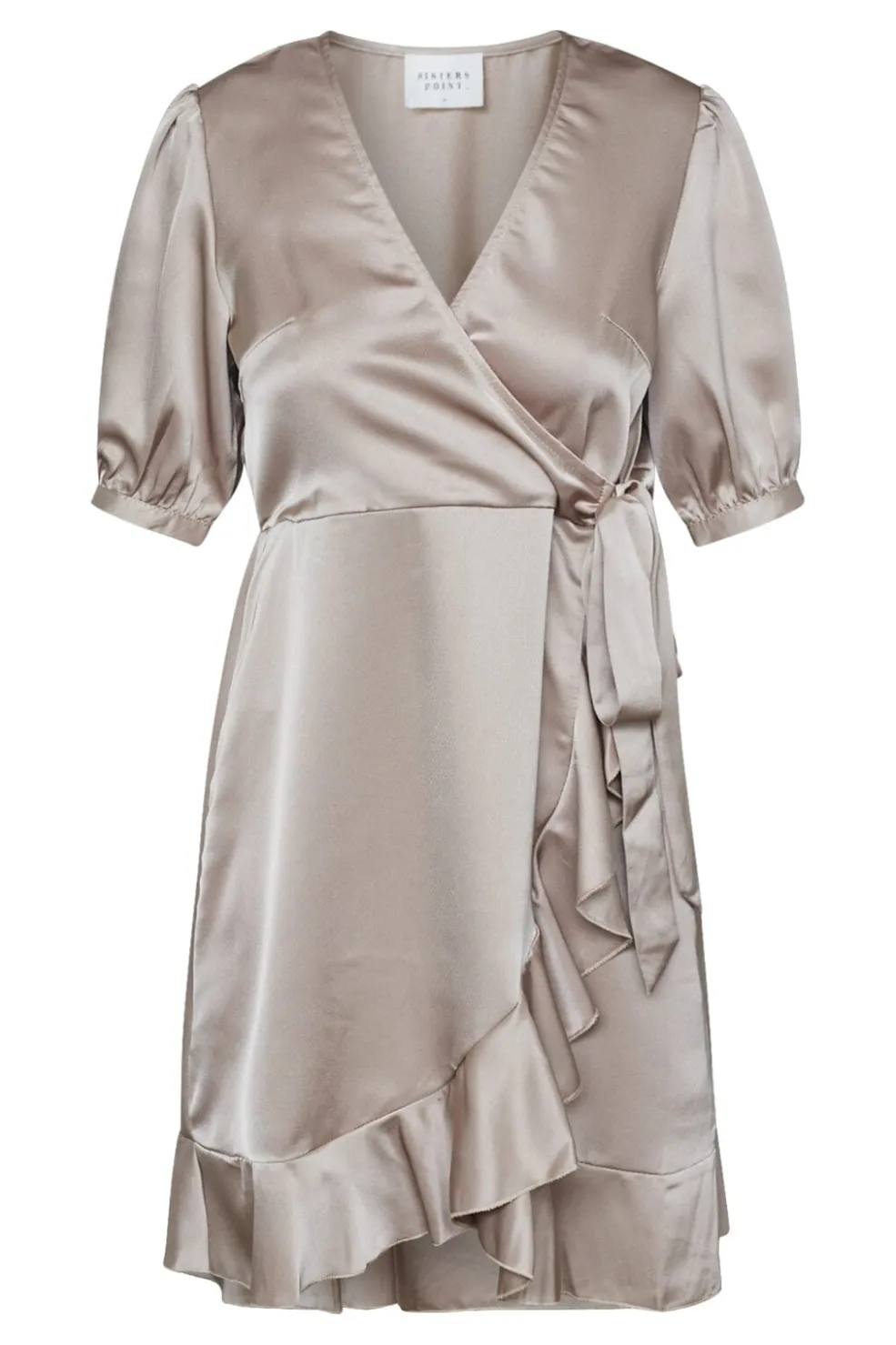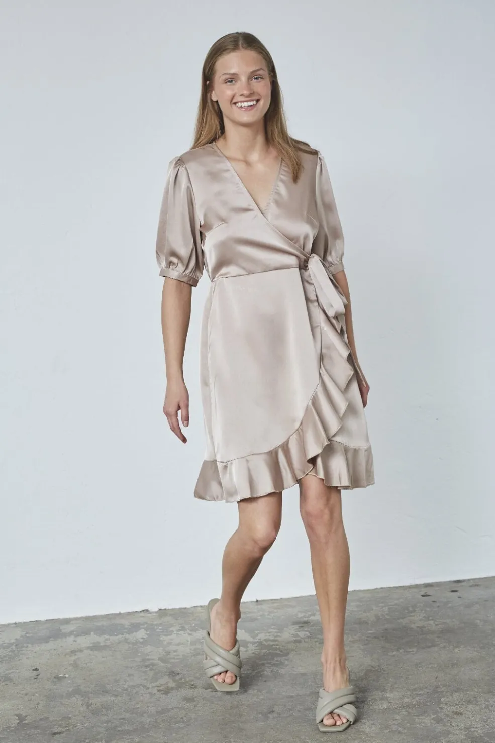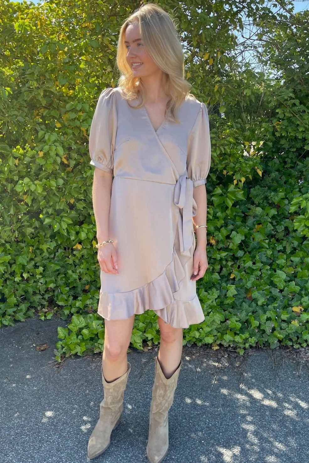 Slå-om-kjole fra Sisters Point i champagnefarvet satinlignende stof. Kjolen har pufærmer, flæsekant ved nederdelen og et bindebånd i siden, der skaber en fin silhuet.