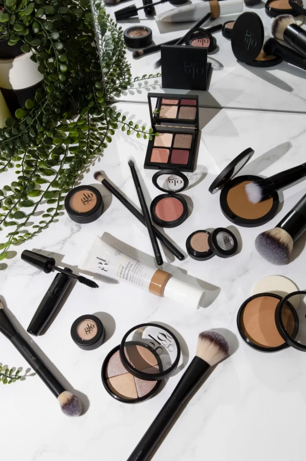 Setting powderbørste fra Glo Skin Beauty med tilspidset form. Børsten har bløde hår og et langt, sort håndtag, der giver god kontrol ved påføring af pudder.