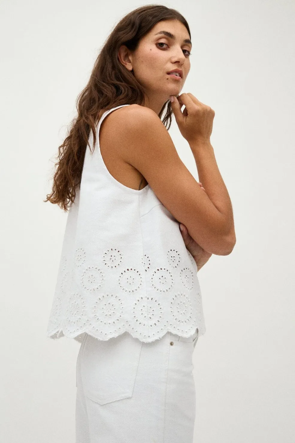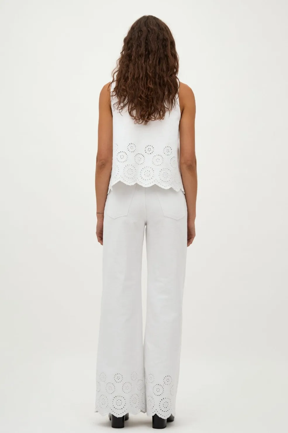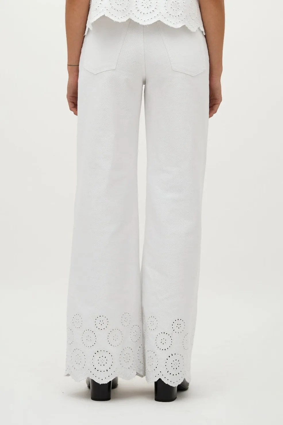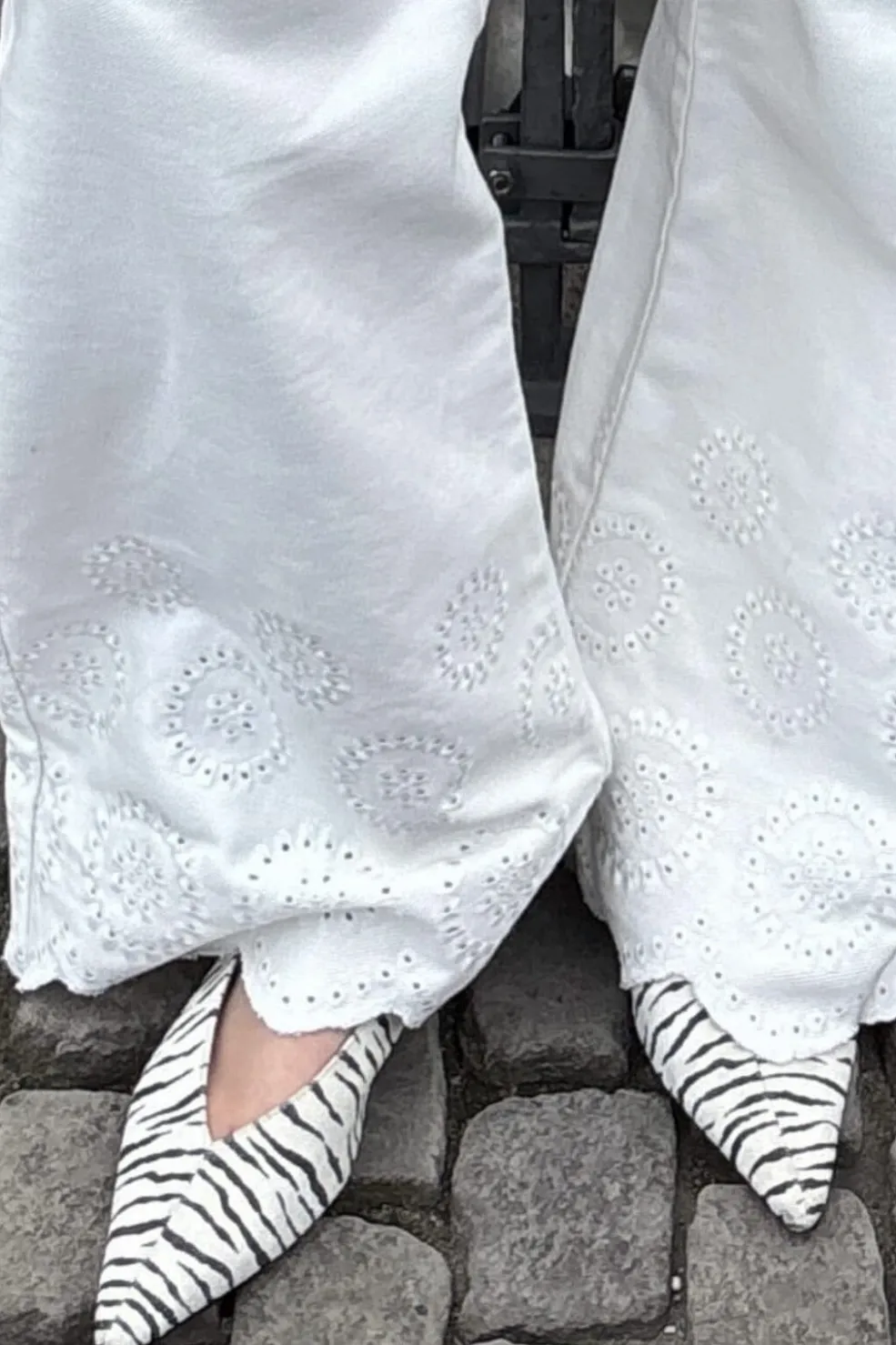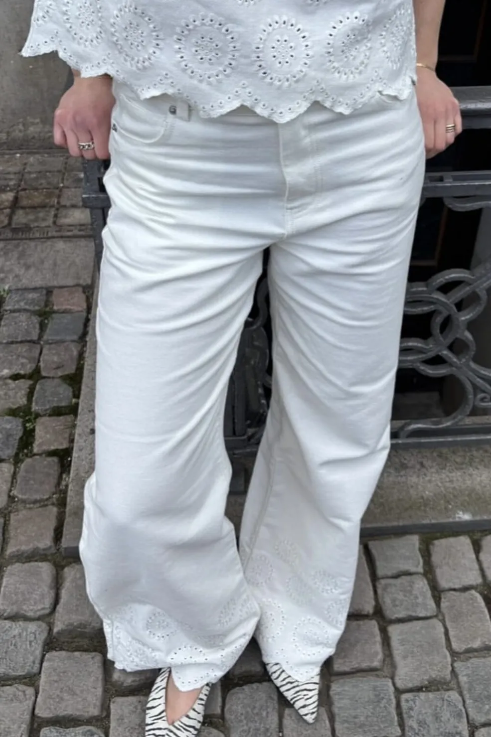 Hvide bukser fra Global Funk med broderede scallop-detaljer ved anklerne. Bukserne har en regular fit og en klassisk lukning med lynlås og knapper.