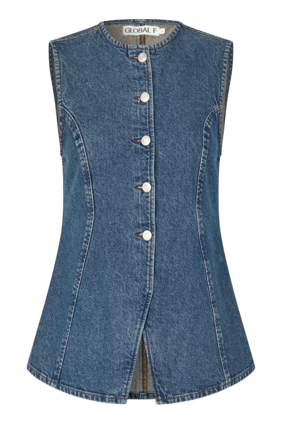 Ærmeløs denimvest fra Global Funk med rund hals. Vesten har en figursyet silhuet med dekorative syninger og hvide knapper foran.