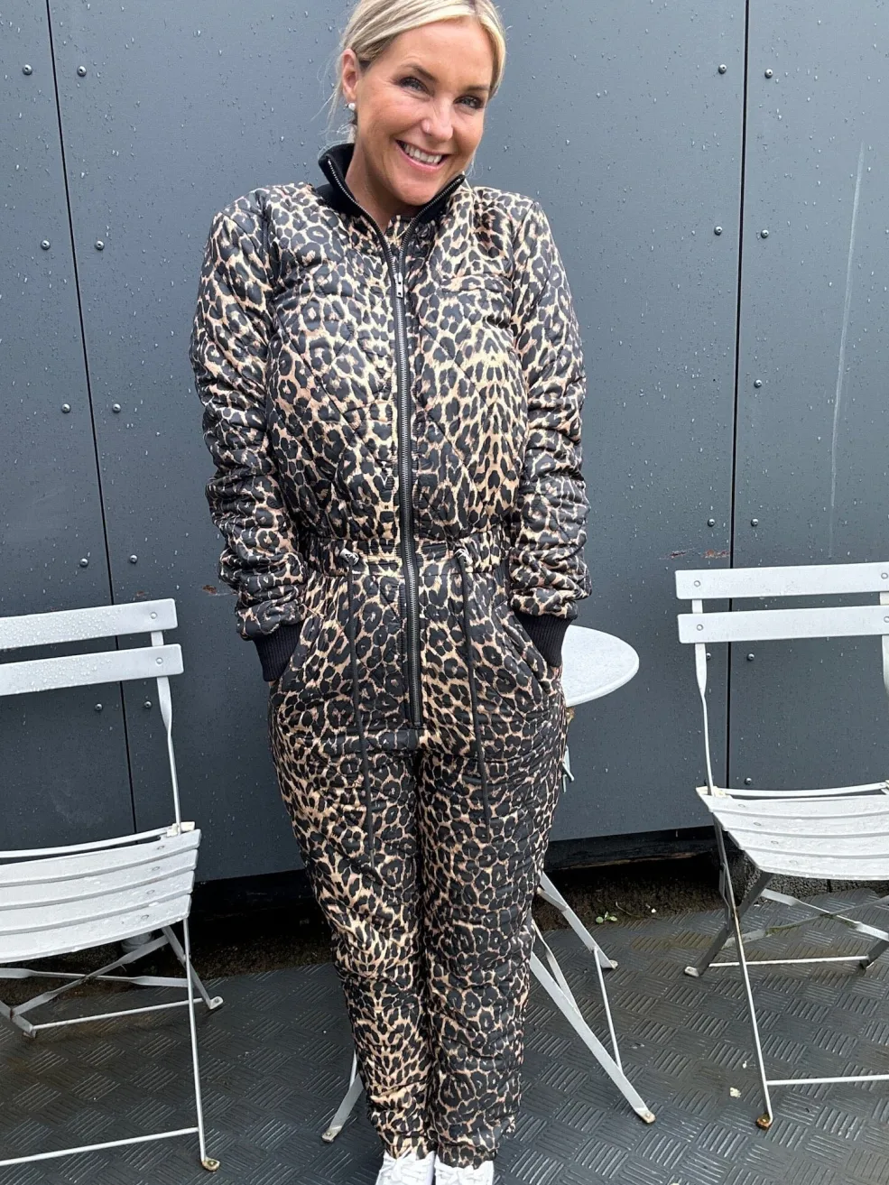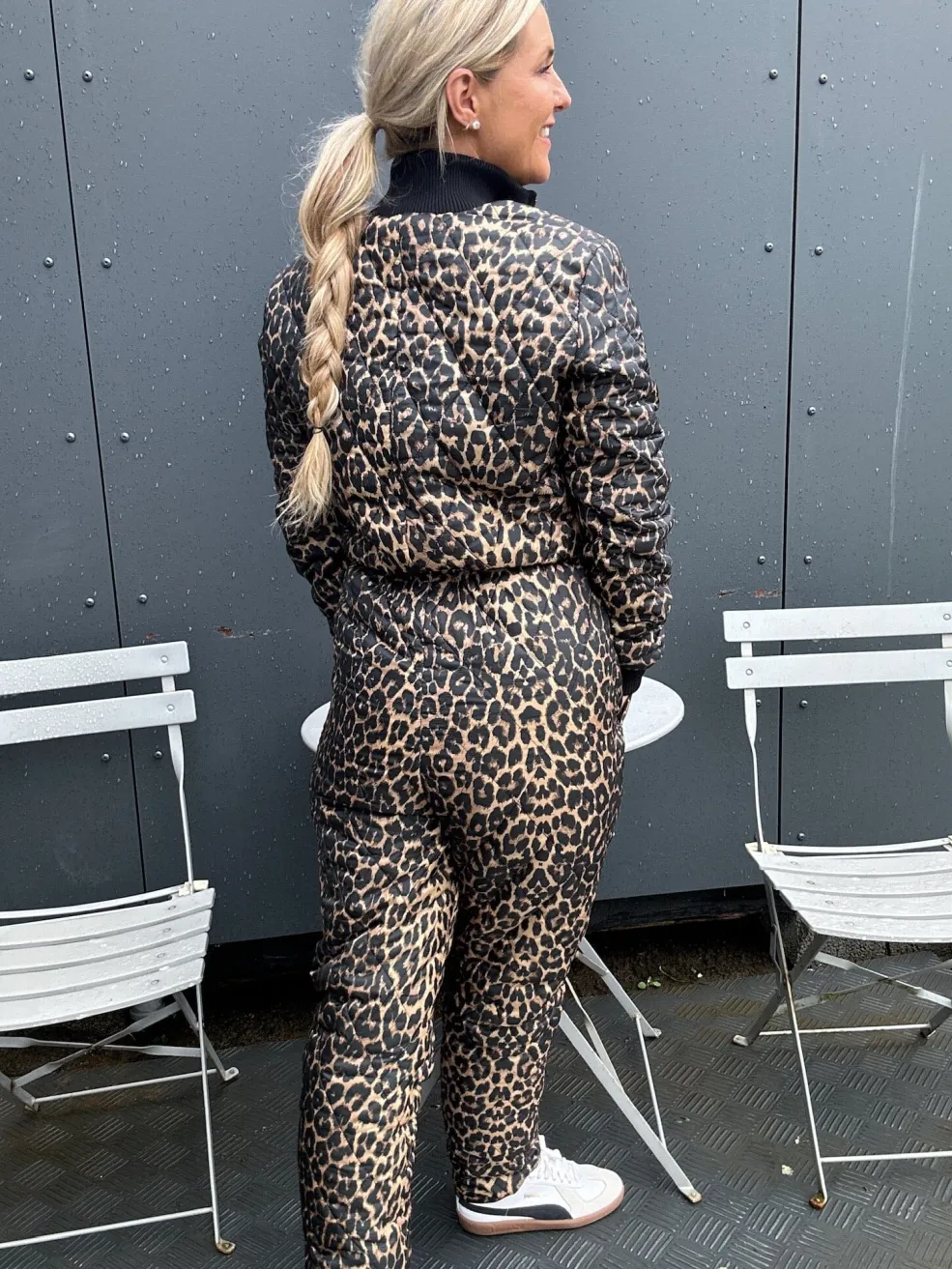 Quiltet jumpsuit med leopardmønster i beige, sort og brune nuancer. Det quiltede design har dekorative syninger, høj krave og elastiske manchetter ved ærmerne og anklerne.