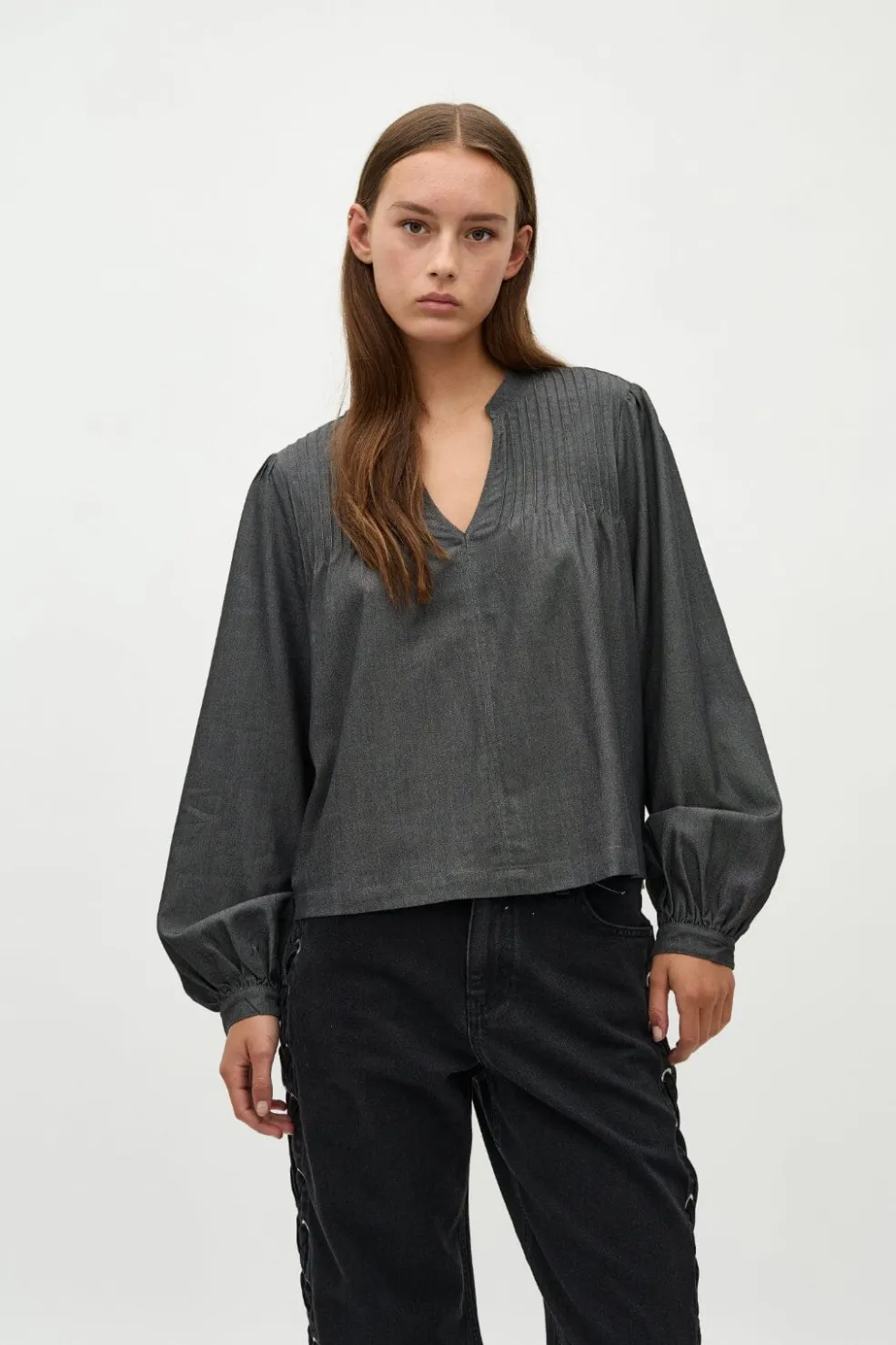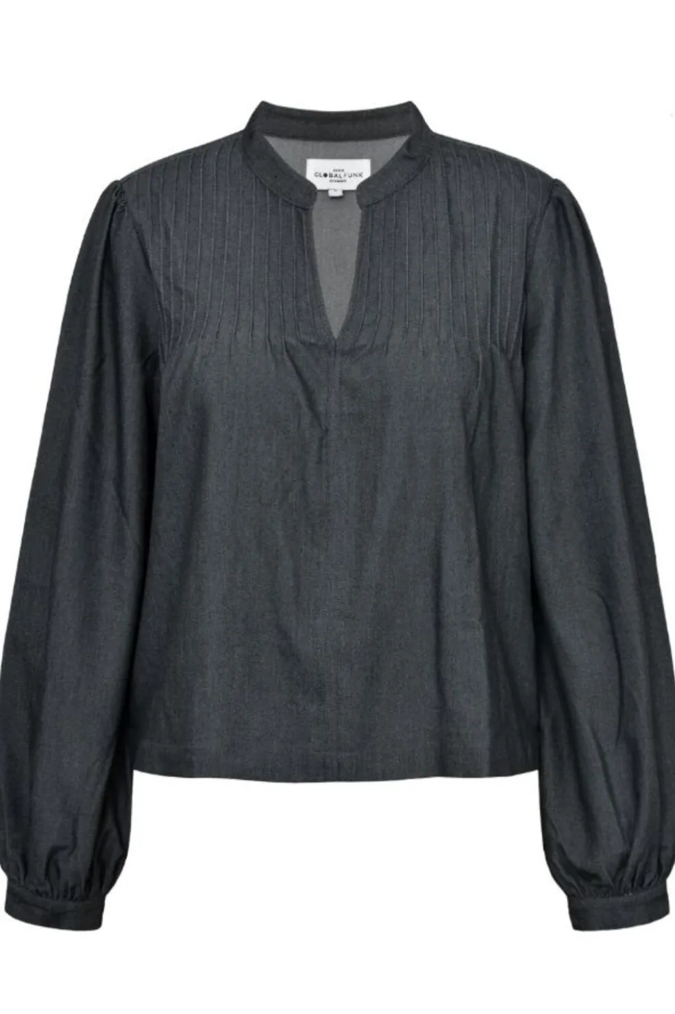 Sort bluse fra Global Funk med v-halsudskæring og lodrette plisseringer. Blusen har lange pufærmer og dekorative syninger, der giver den et gennemført design.