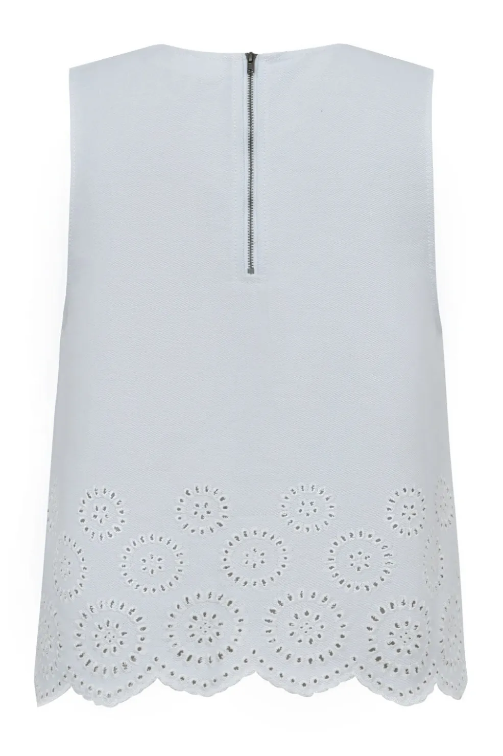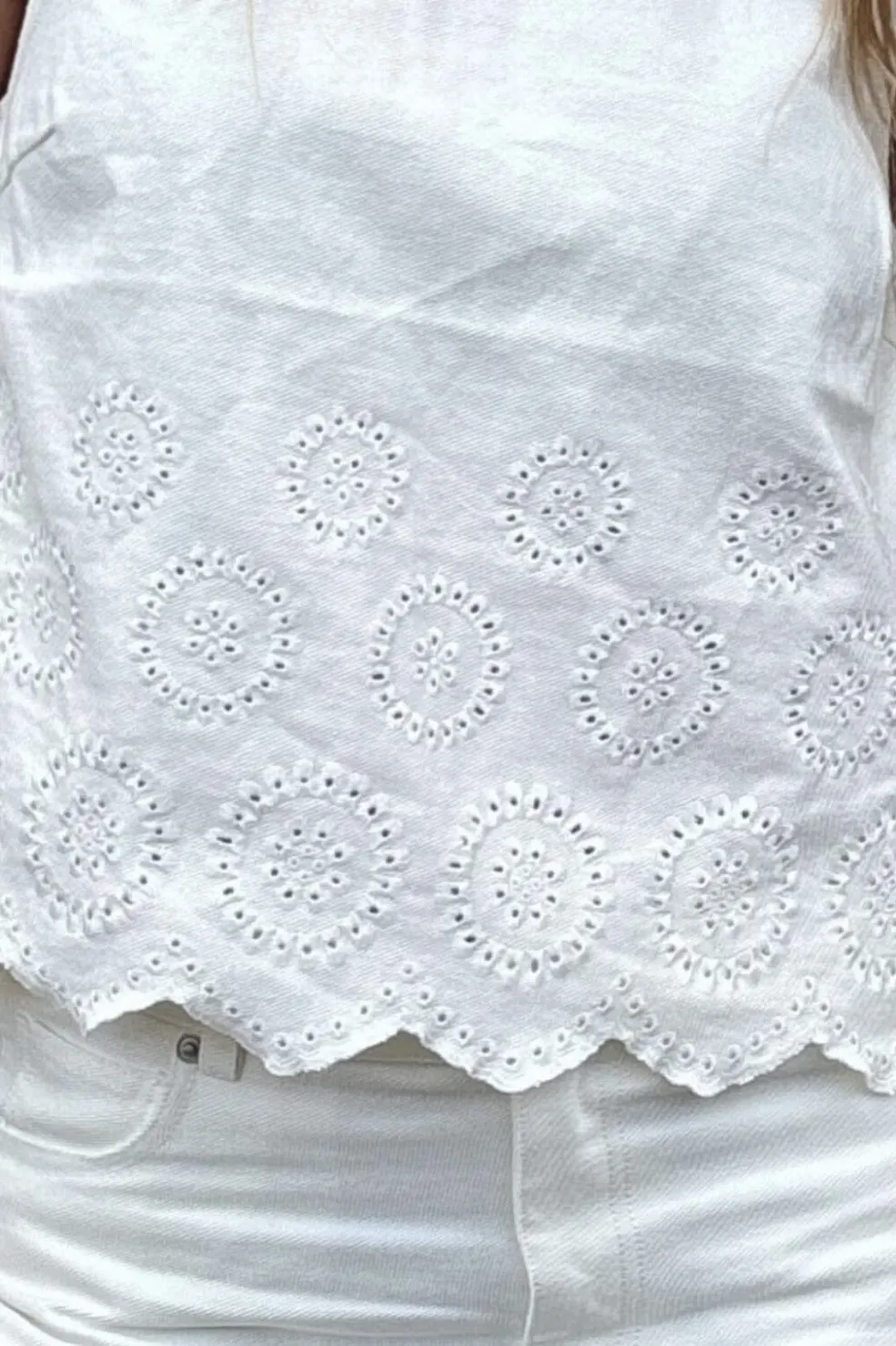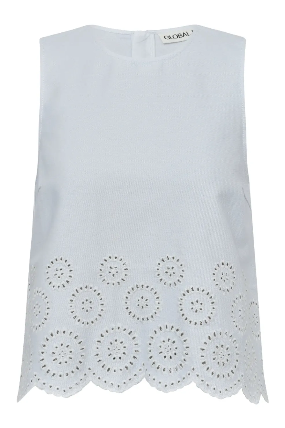 Hvid ærmeløs top fra Global Funk med scallop-kant og cirkulært broderi. Den har en rund halsudskæring og en almindelig pasform, der giver god bevægelsesfrihed.