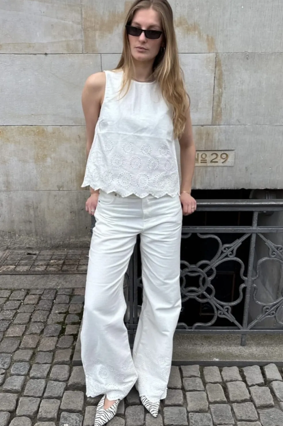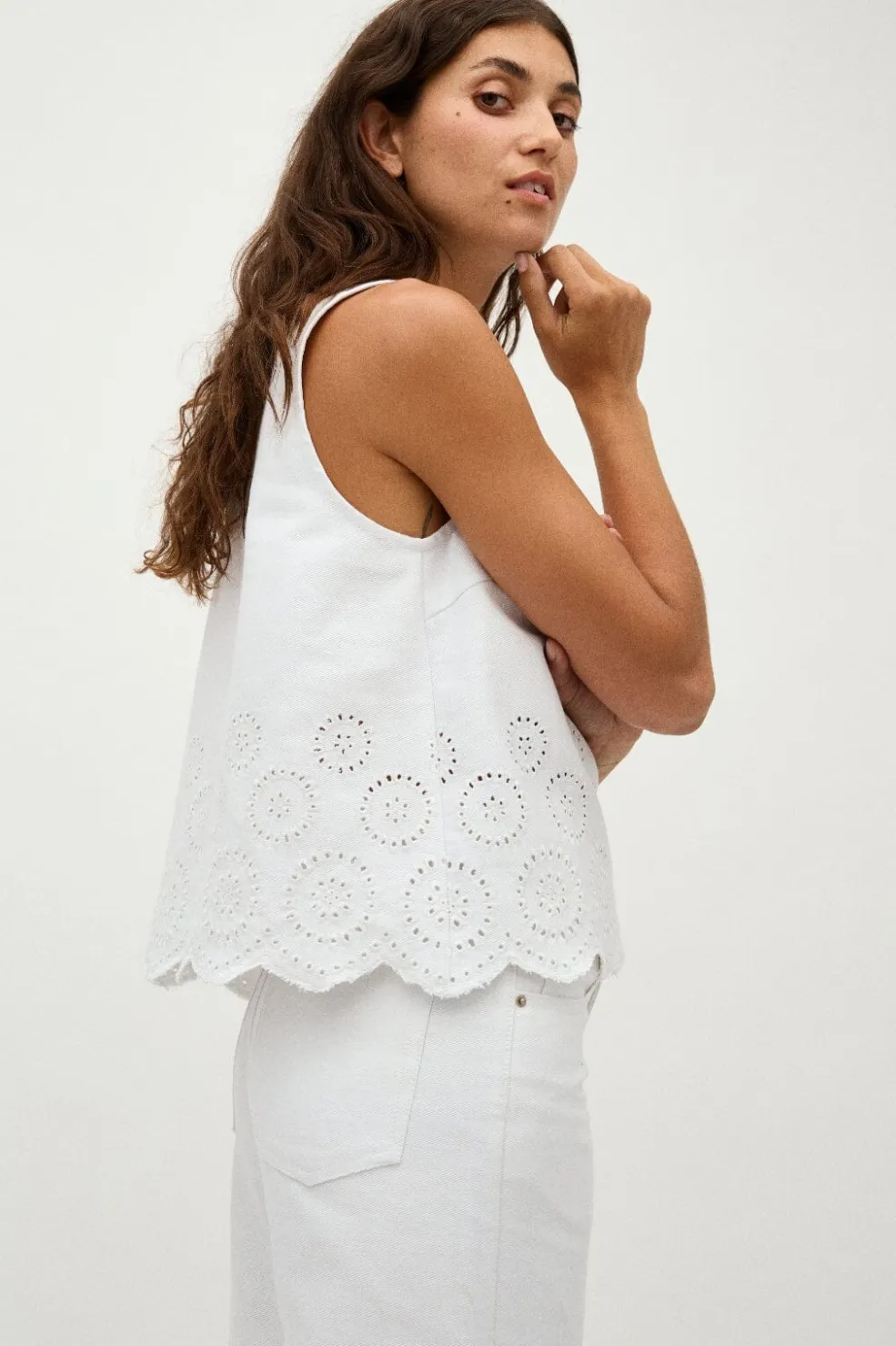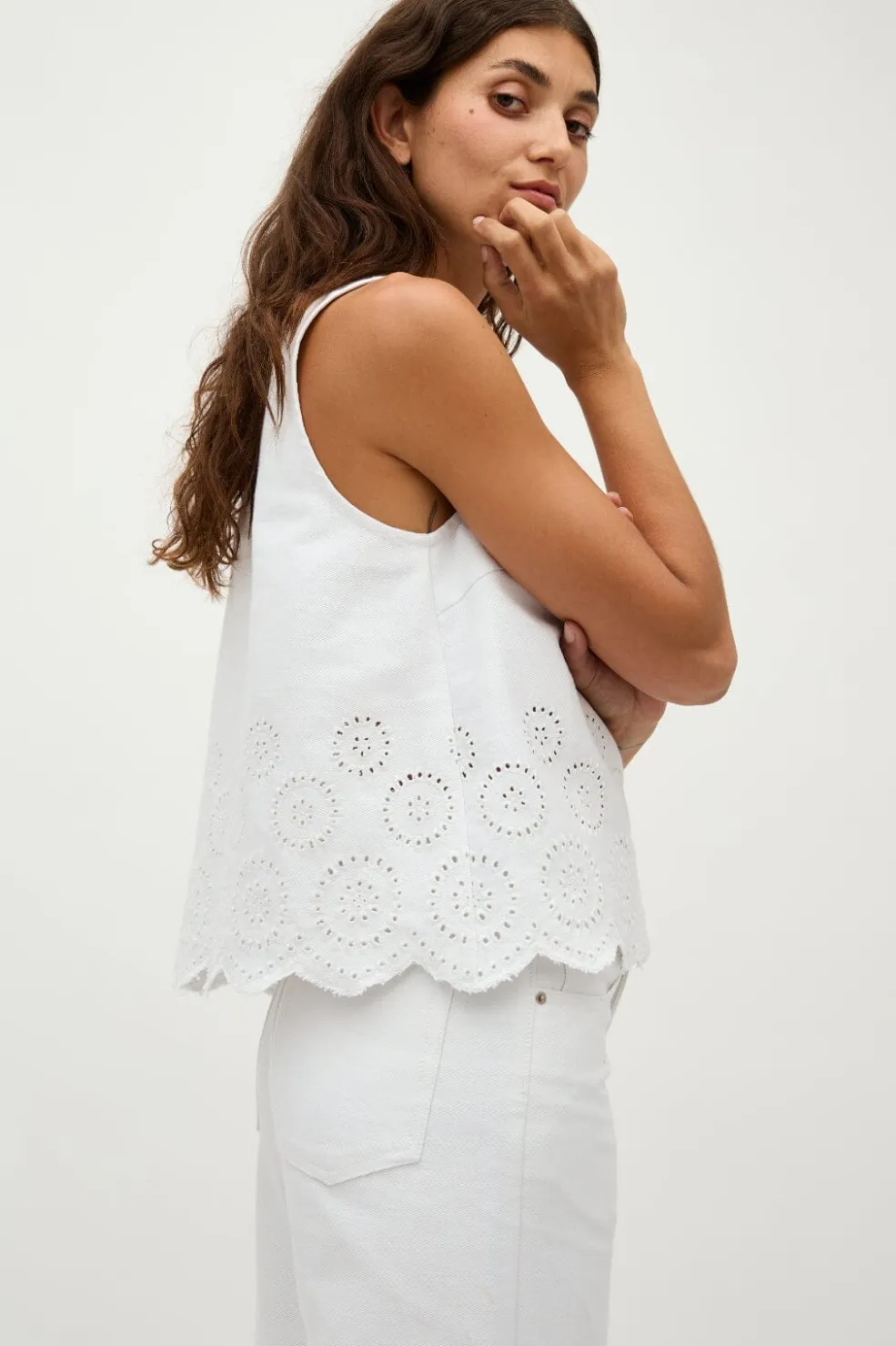 Hvid ærmeløs top fra Global Funk med scallop-kant og cirkulært broderi. Den har en rund halsudskæring og en almindelig pasform, der giver god bevægelsesfrihed.