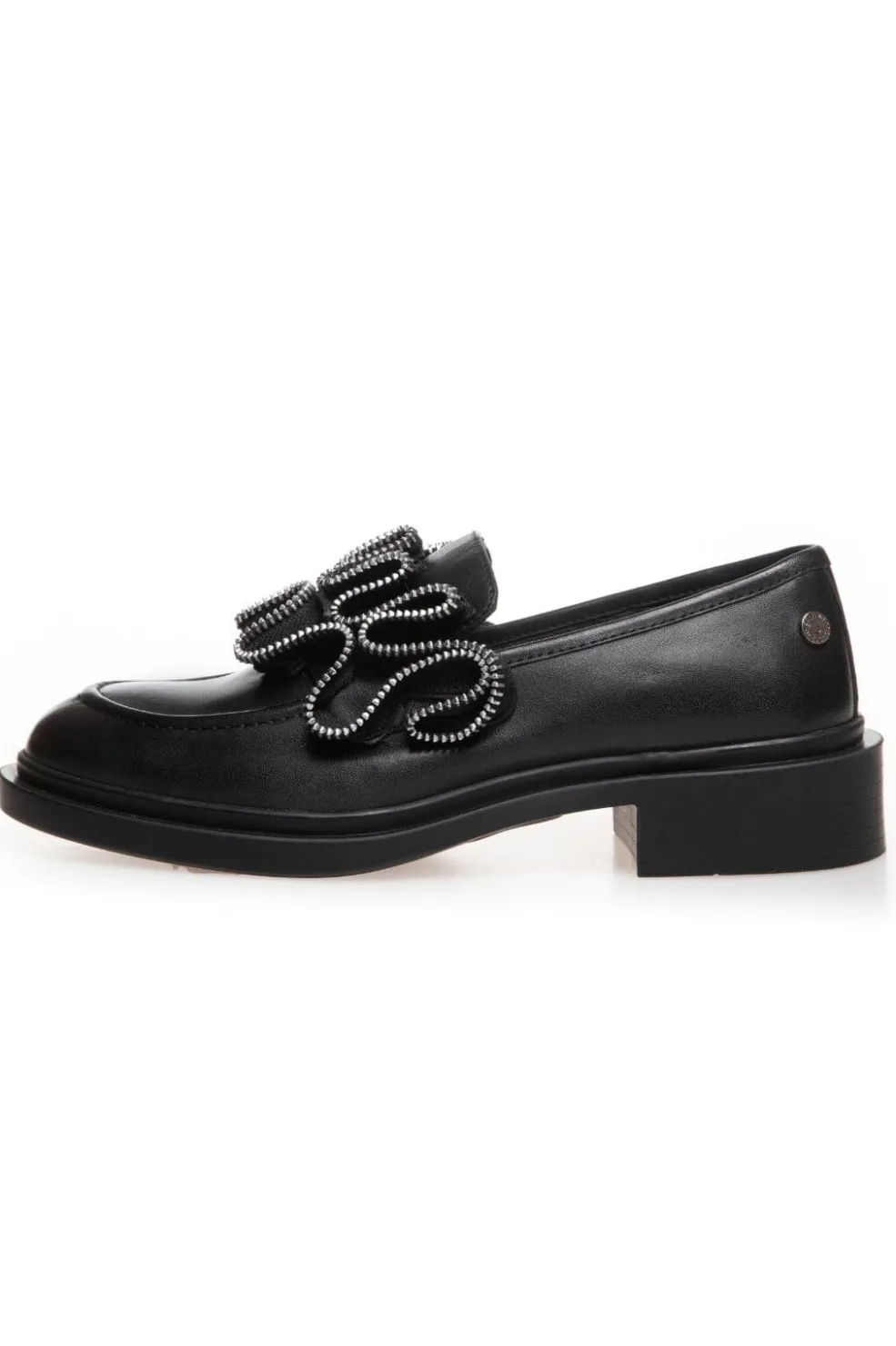Sorte loafers fra Copenhagen Shoes i læder med rynkedetaljer på oversiden. Skoen har en rund tå og en lav hæl, der gør den praktisk til hverdagsbrug.