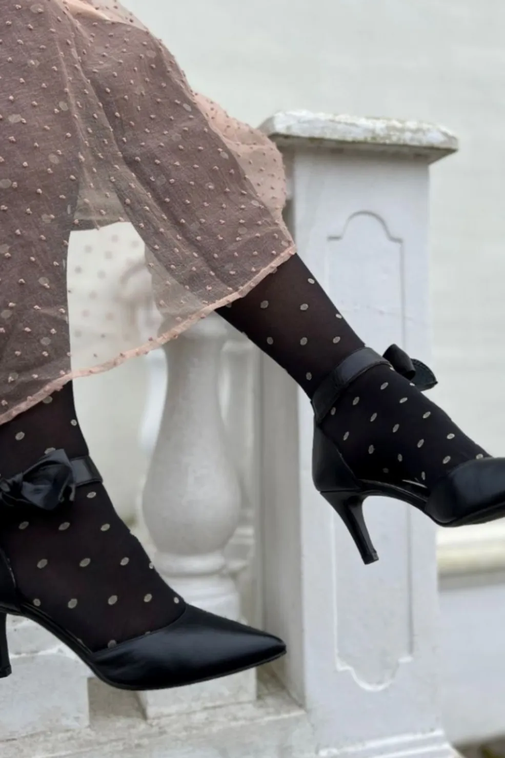 Sorte stiletter fra Copenhagen Shoes med spids tå og ankelrem. Skoen har en aftagelig sløjfe ved remmen og er lavet af blødt læder med stilethæl.
