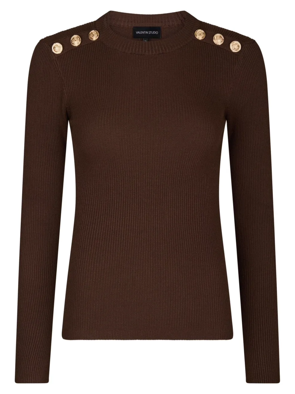 Mørkebrun strikbluse fra Valentin Studio med tyndstrikket tekstur. Blusen har en tætsiddende pasform og dekorative guldknapper på skuldrene, som giver et fint pift.