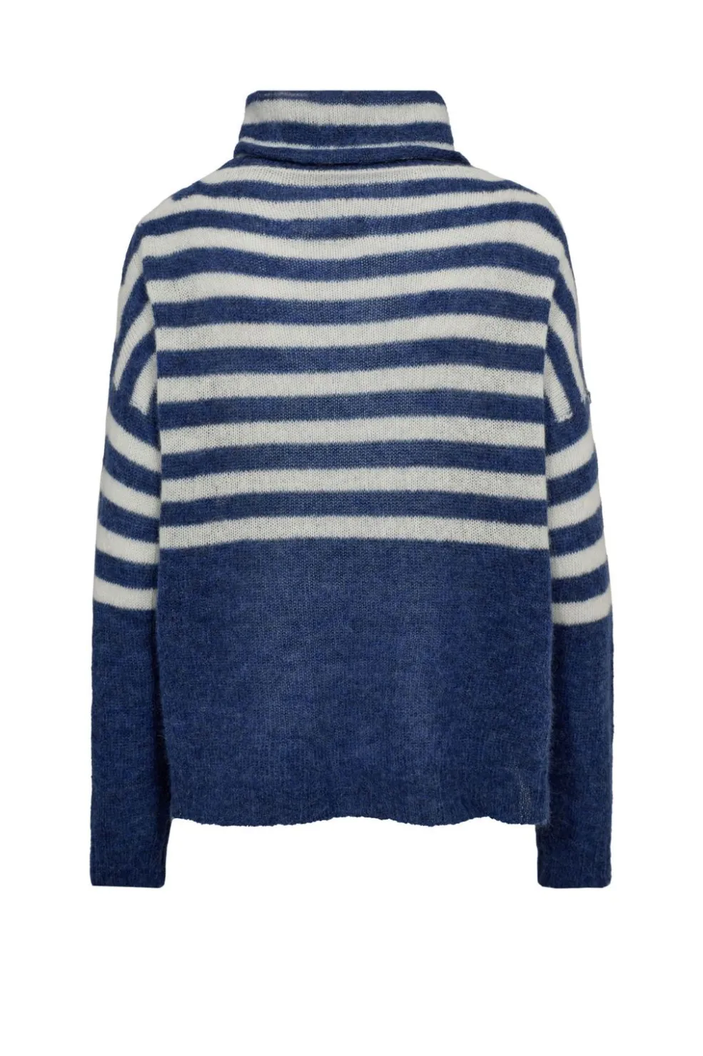 Stribet sweater fra Gossia i blå og off-white. Den har lange ærmer og et løst fit, og den passer godt til afslappede lejligheder.