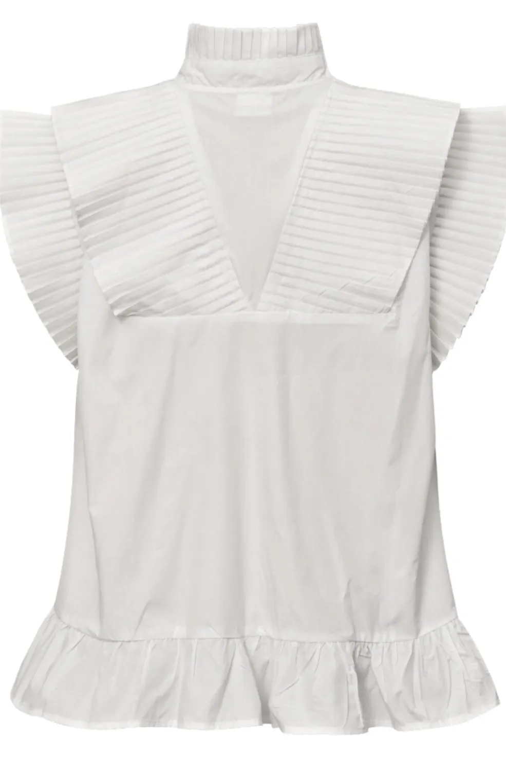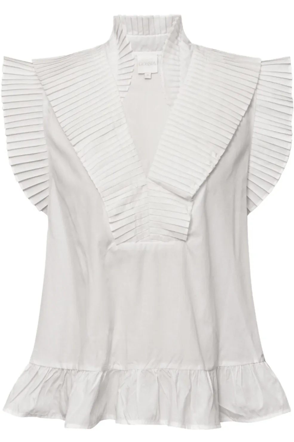 Off-white top fra Gossia med høj hals og V-udskæring. De plisserede detaljer på kraven og skuldrene giver toppen et særligt design, mens flæsen i bunden runder looket af.