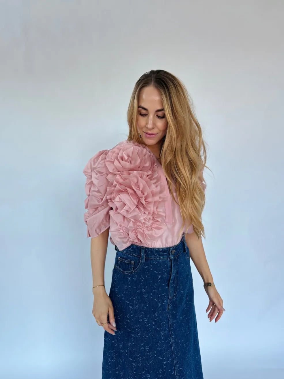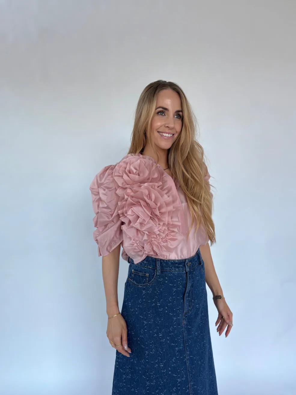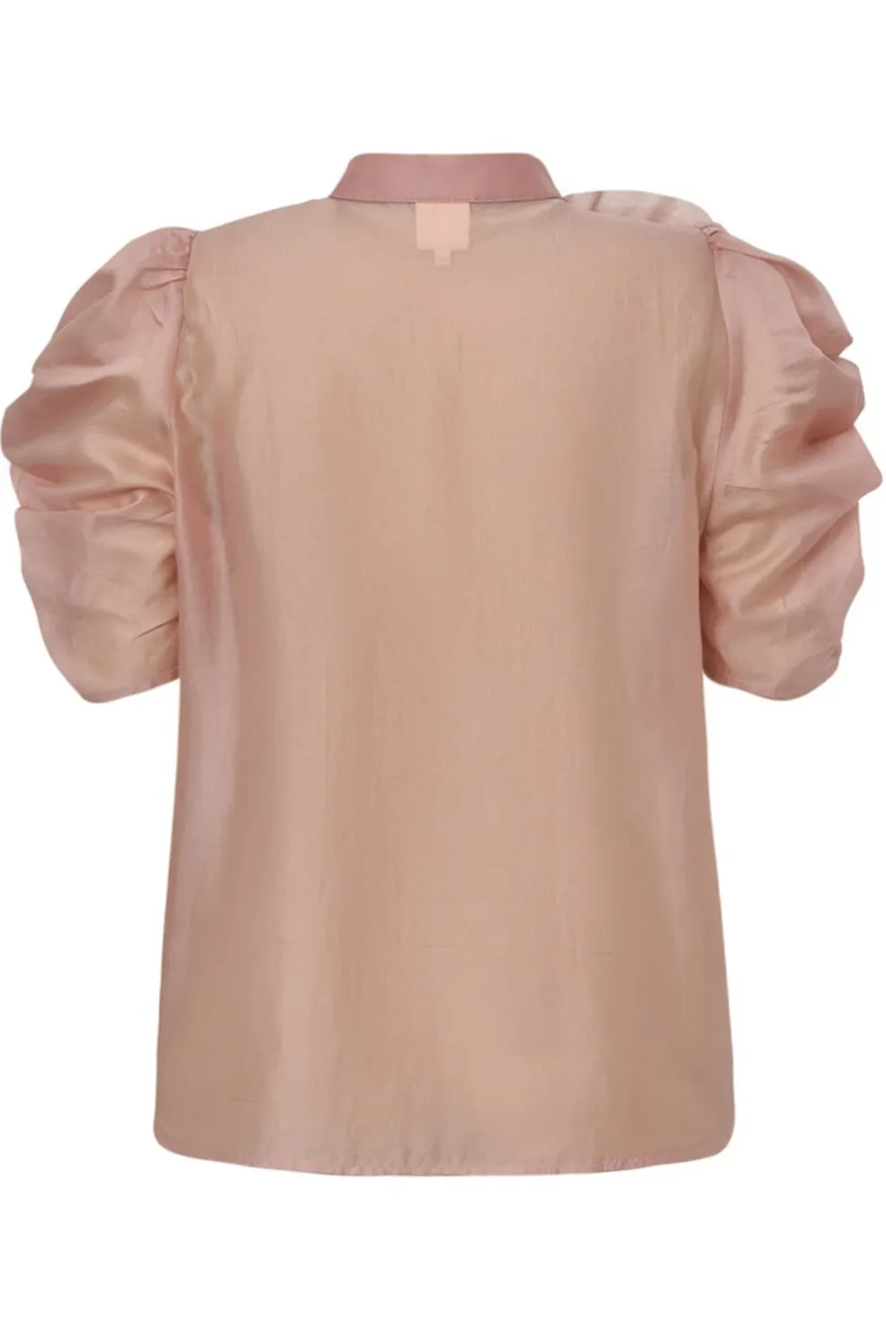Støvet rosa bluse fra Gossia, lavet af blødt materiale med rynkede detaljer på skulderen. Blusen har korte, puffede ærmer og høj hals med knaplukning.