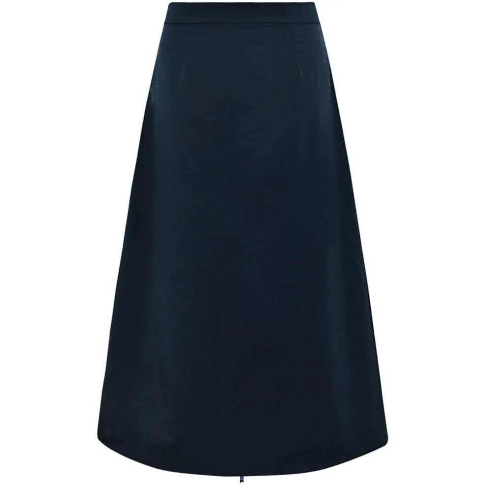 Mørkeblå nederdel fra Gossia med en lang længde og en synlig lynlås foran. Nederdelen har folder og en A-formet silhuet.