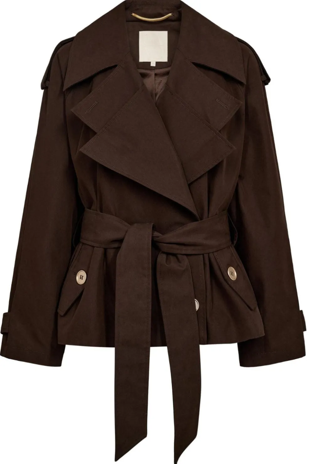 Brun trenchcoat fra Gossia i farven Toffee. Coaten passer til både formelle og afslappede lejligheder, og den har klassiske detaljer som bredt revers og bælte i taljen.