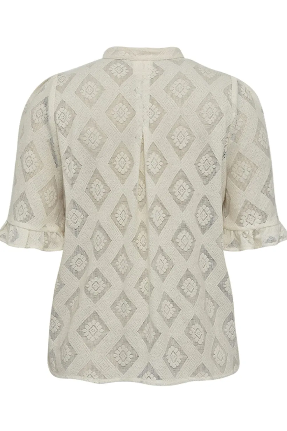 Cremefarvet skjorte fra Gossia med geometrisk blondemønster over hele skjorten. Skjorten har skjortekrave, knaplukning foran og 3/4 ærmer med let flæsekant.