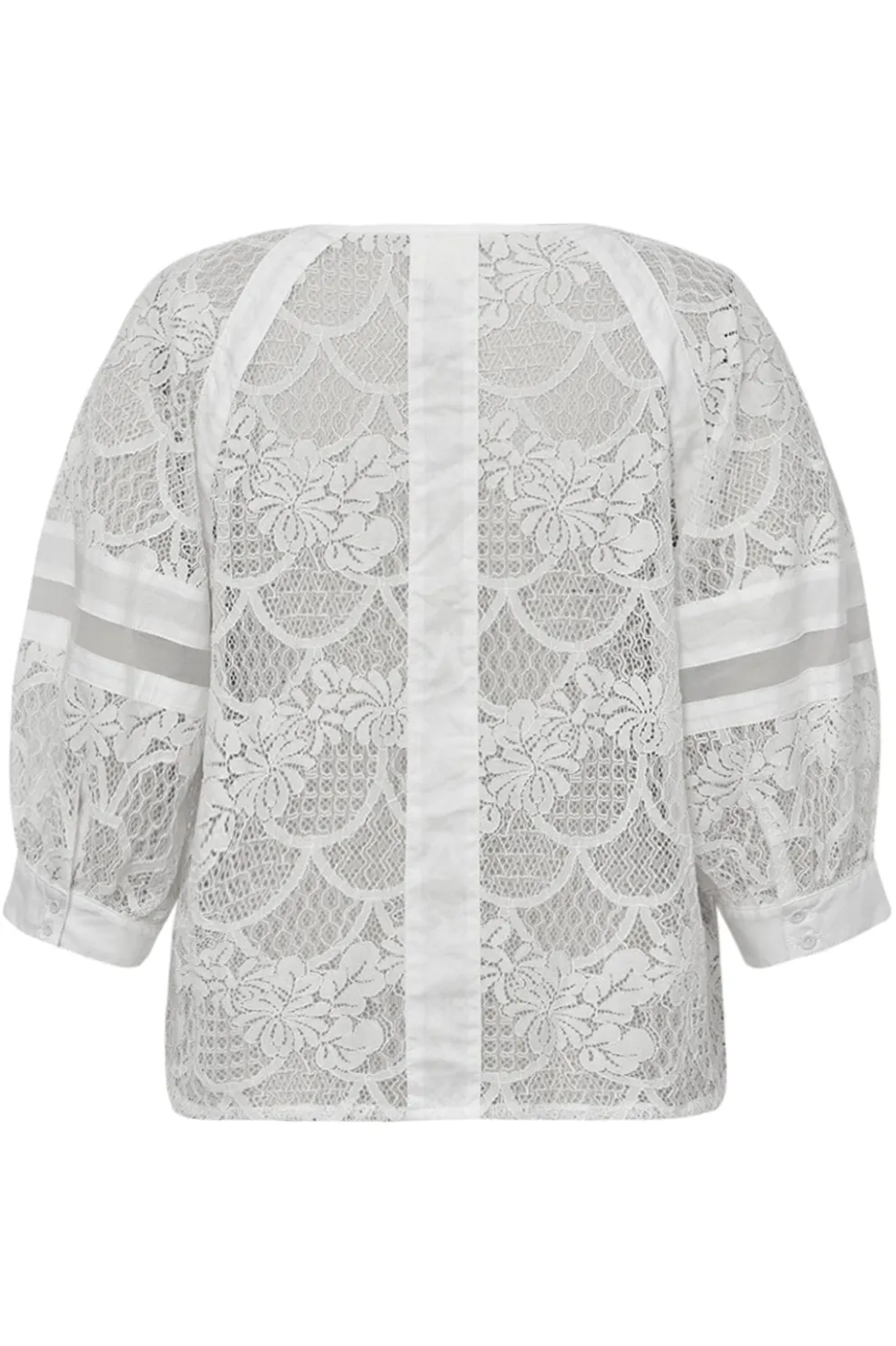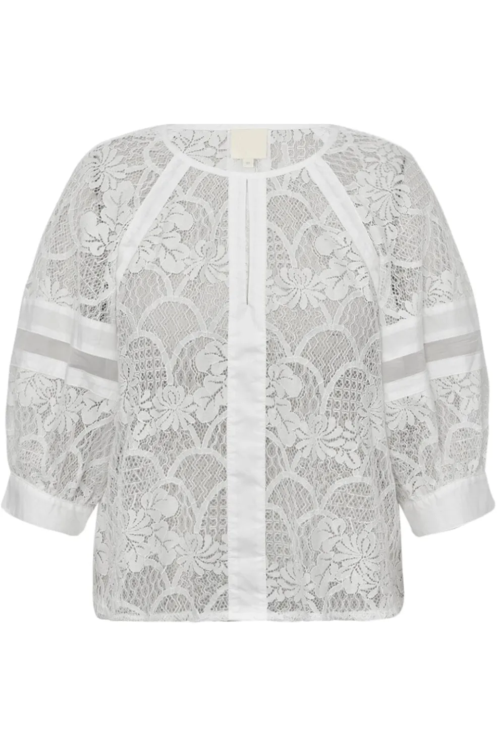 Hvid bluse fra Gossia med blomstret blondemønster. Blusen har puffede 3/4-ærmer og rund hals. Designet kombinerer blonder med glatte bomuldsstrimlinger.