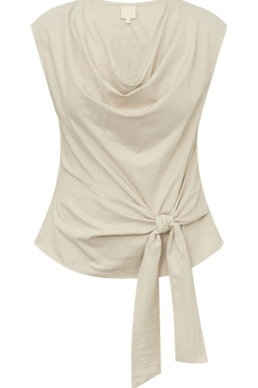 Ærmeløs bluse fra Gossia i champagnefarvet stof. Den har en draperet V-hals og et bindebånd i taljen, der skaber en flot silhuet.
