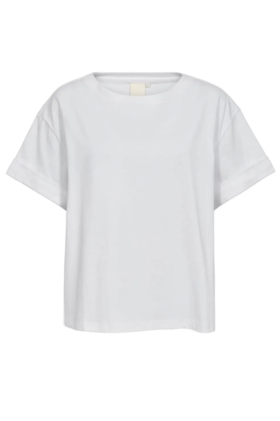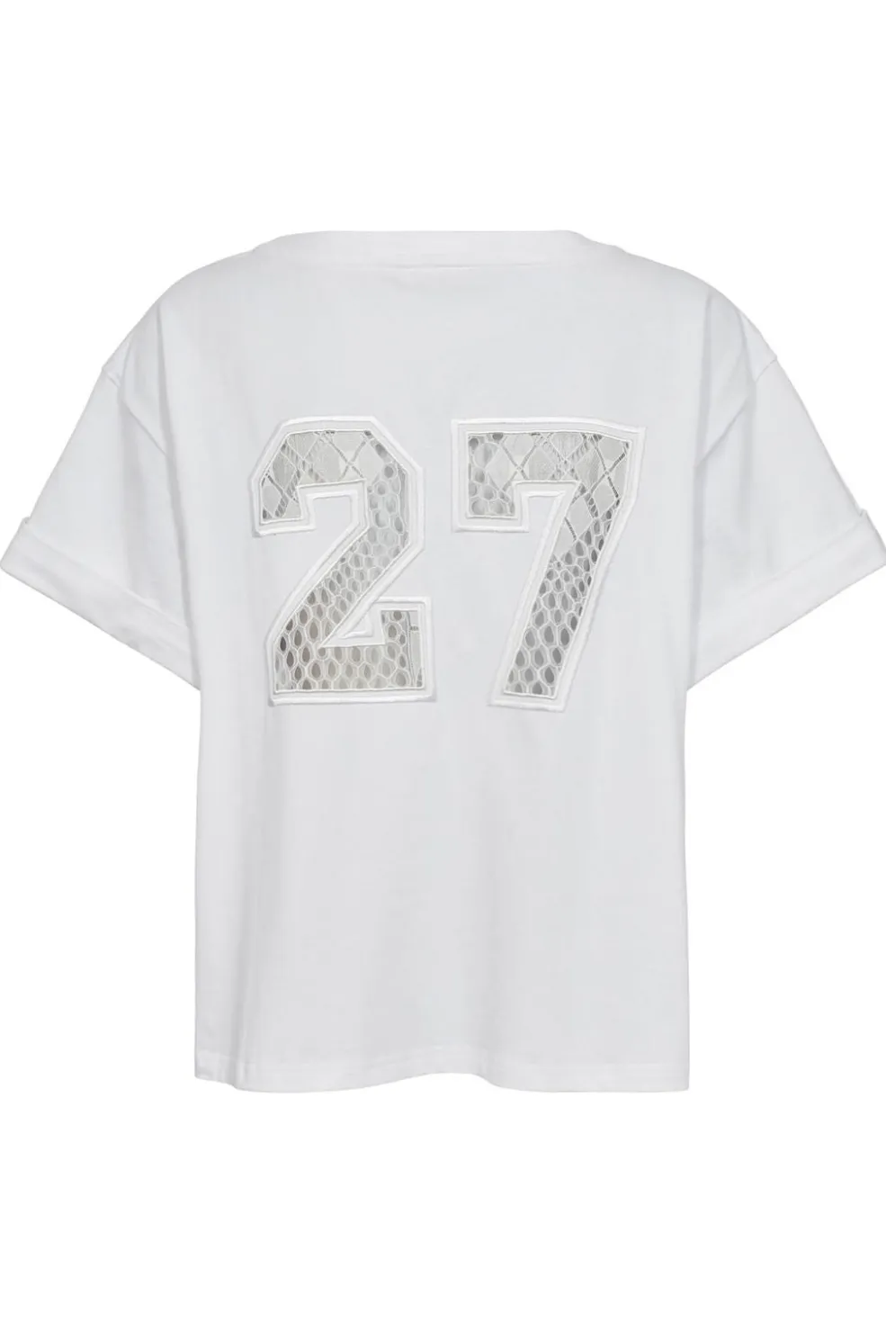 Hvid T-shirt fra Gossia med dekorative syninger og blonder på ryggen. Blusen har et dyreprintmønster og er lavet af bomuld.