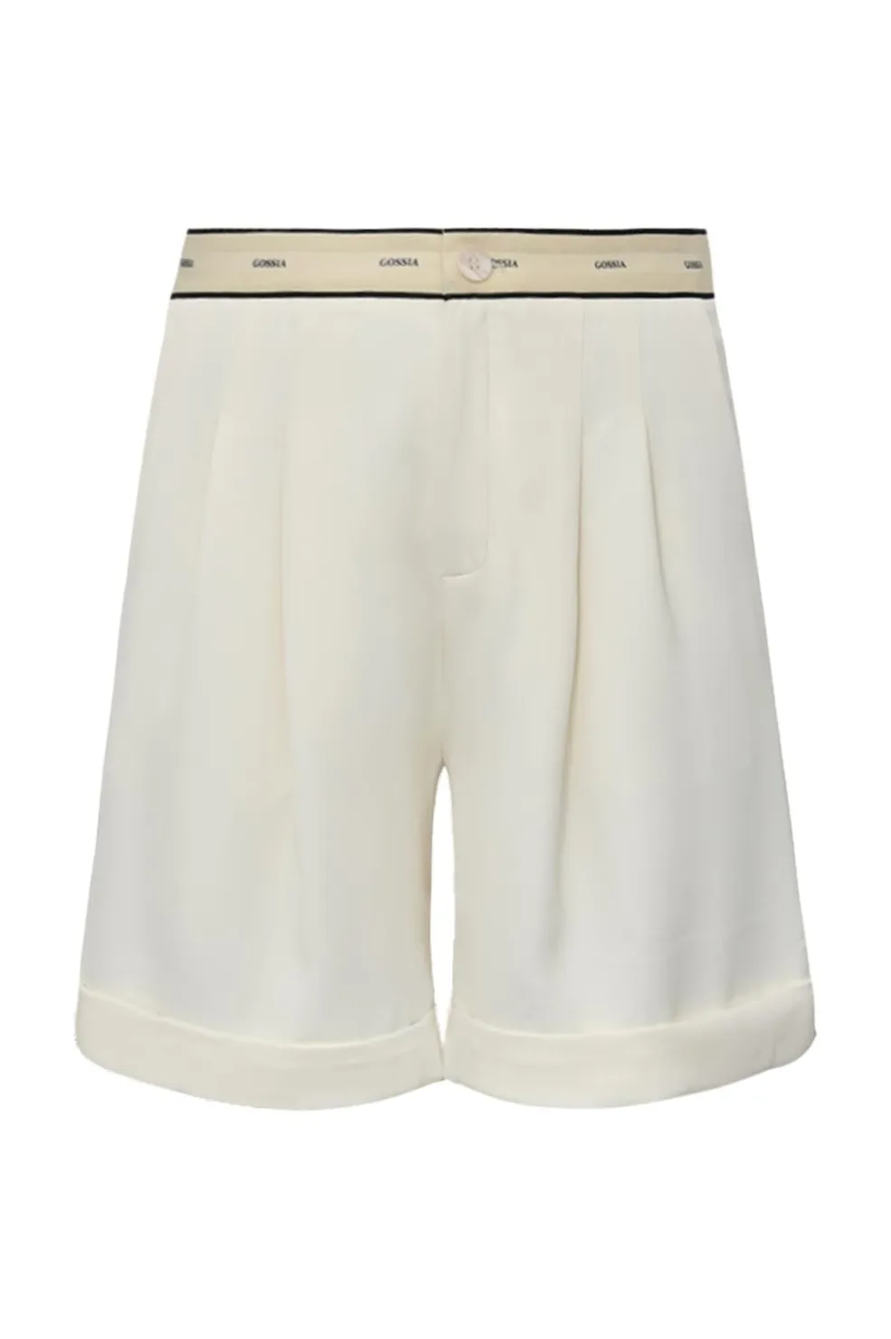 Cremefarvede shorts fra Gossia med plisseret front og sort kontrastbånd i taljen. Shortsene har en rullet kant og lårlang længde.