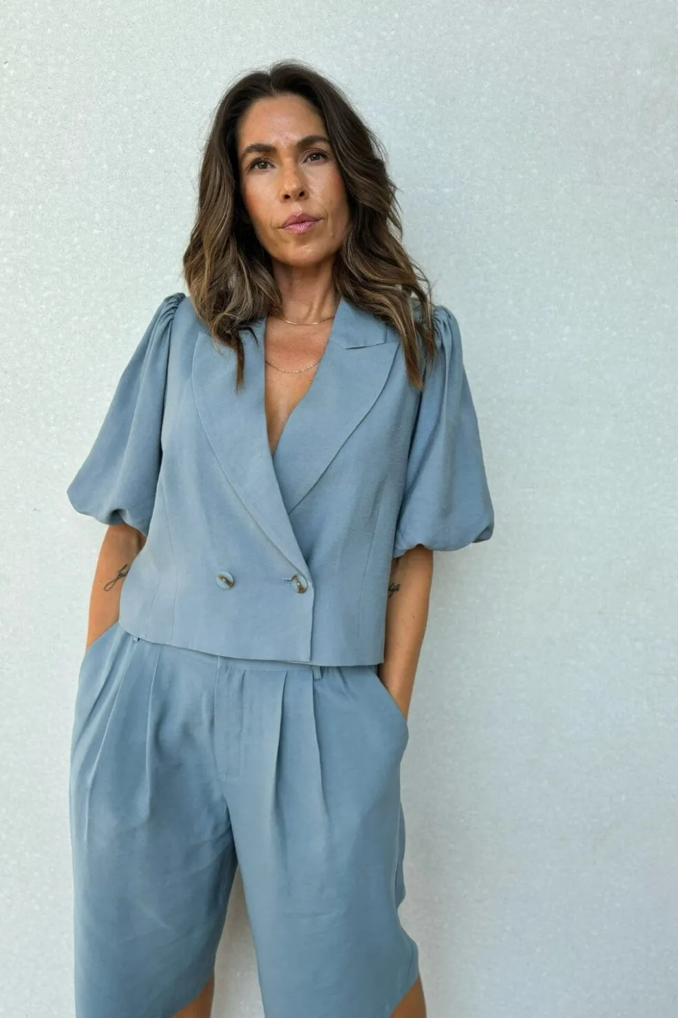 Bermudashorts fra Gossia i blå stenfarve med plisseret design. Shortsene har både sidelommer og baglommer samt lynlås og knaplukning.