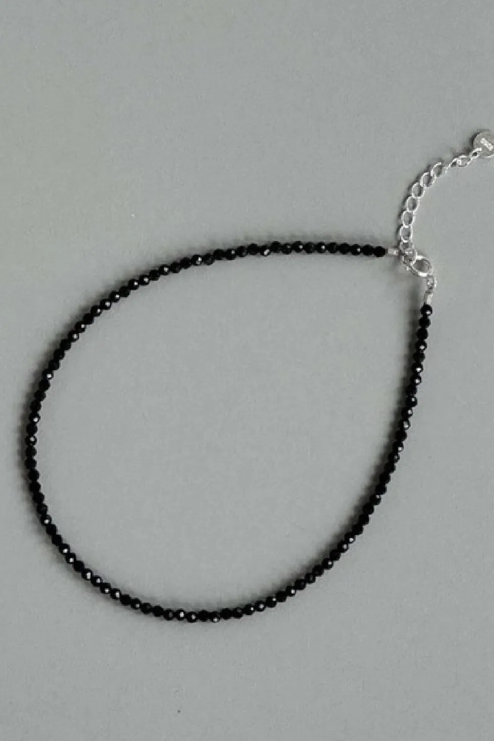Håndlavet ankelkæde fra Sorelle Jewellery. Den er fremstillet på et dansk værksted med sort spinel og sterling sølv som hovedmaterialer.