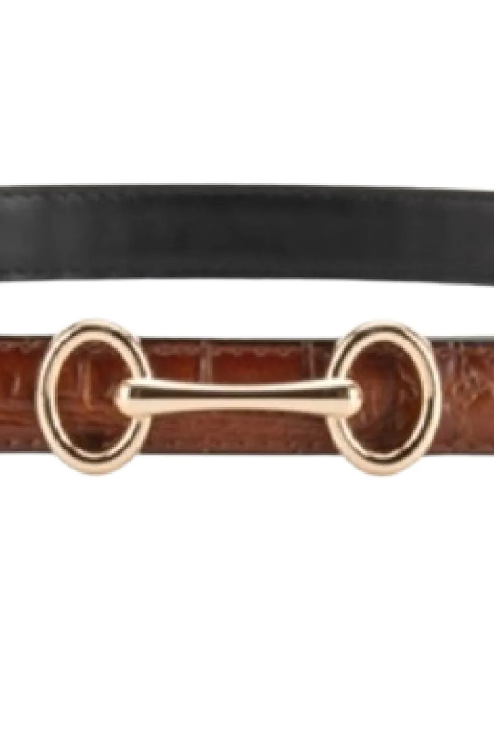 Bælte fra Plissé Copenhagen med krokodillemønsteret overflade i cognacfarvet læder. Bæltet har et guldfarvet spænde og passer til både kjoler og bukser.