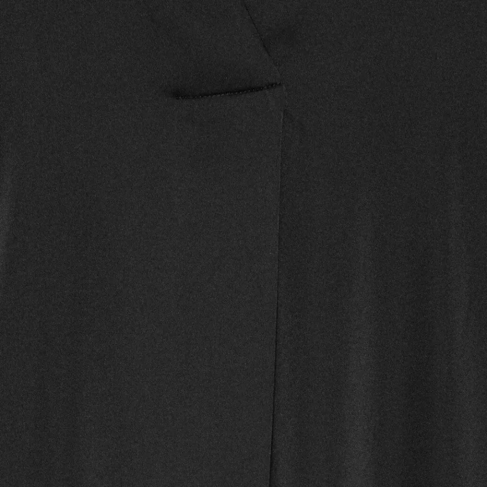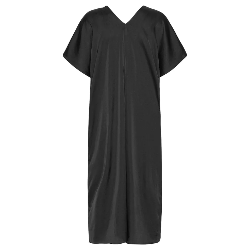 Sort kjole fra Karmamia med v-hals og korte ærmer. Kjolen har knælængde og en løs pasform, der gør den brugbar til både hverdag og særlige anledninger.