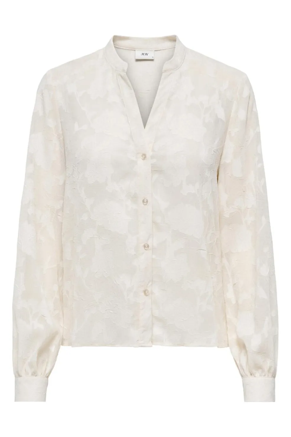 Lysegrå skjorte fra JDY med V-hals og lange ærmer. Skjorten har et struktureret mønster med blomsterlignende detaljer i beige, grå og hvide nuancer.