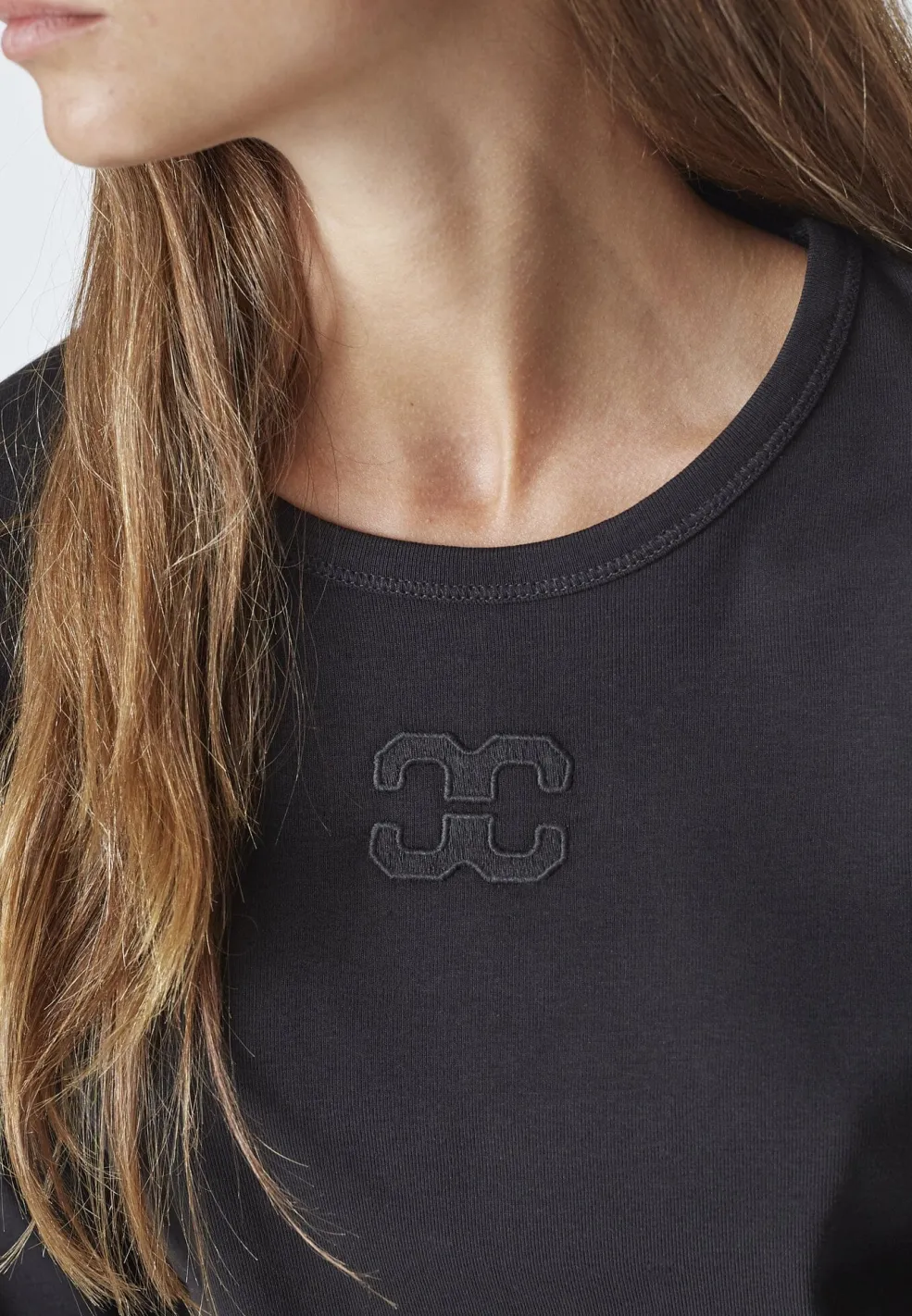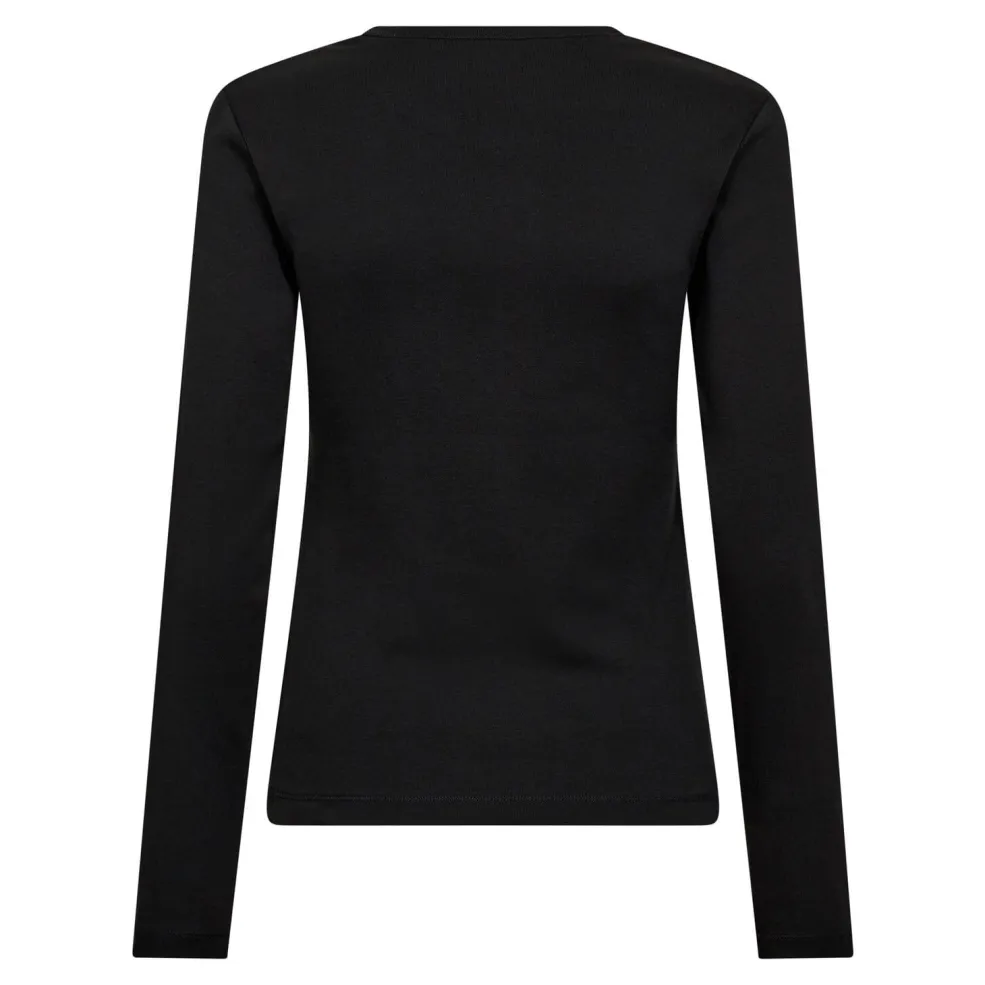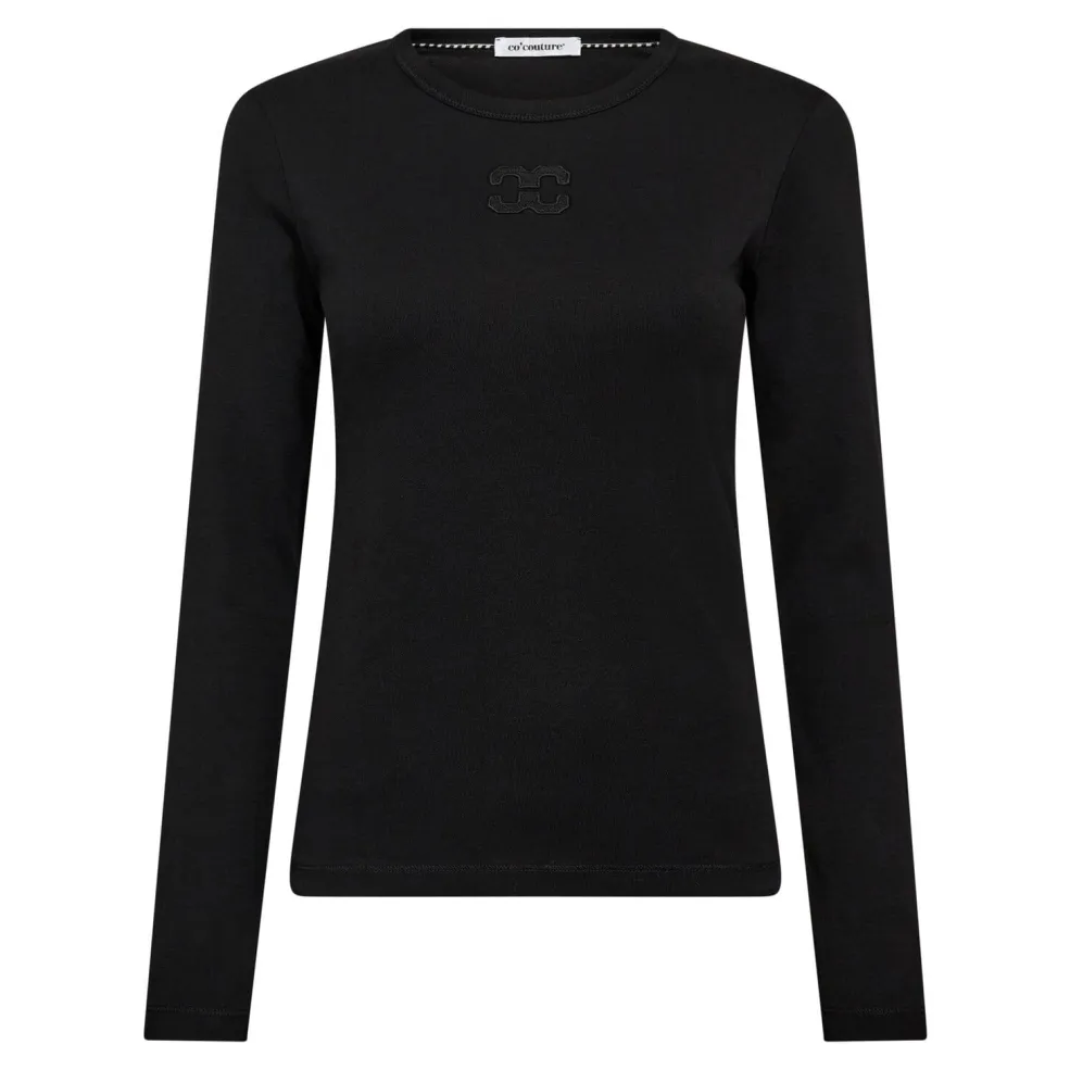 Sort langærmet t-shirt fra Co´Couture med dekorativt broderi på brystet. T-shirten har en slim fit og en rund halsudskæring.