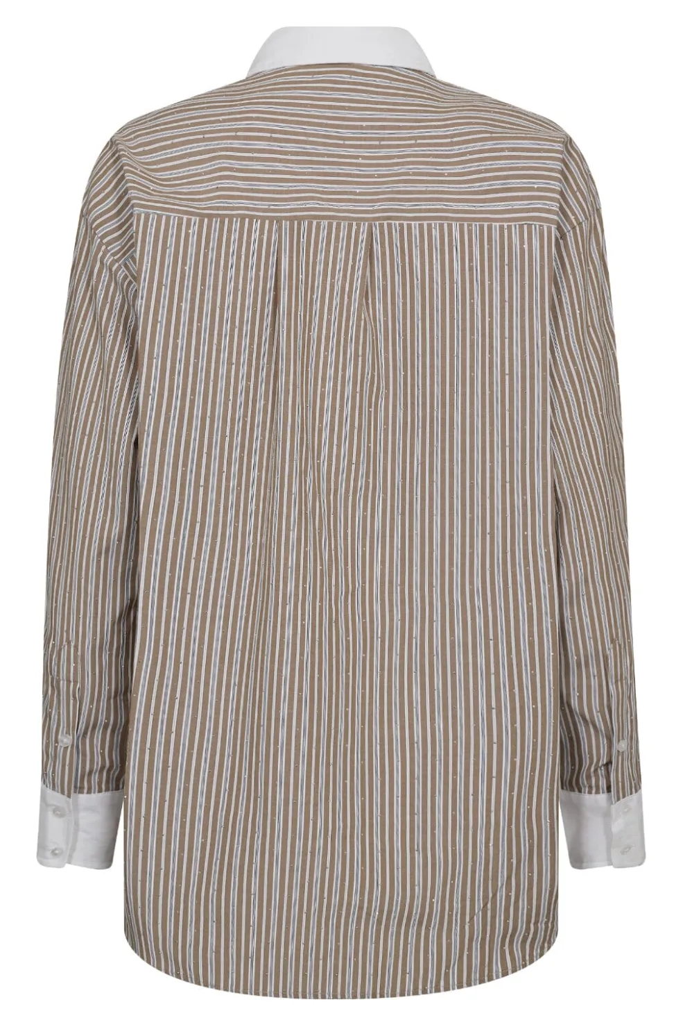 Stribet skjorte fra Co’Couture i valnøddebrun og hvid. Den har hvid krave og manchetter, som står i kontrast til de lodrette striber. En brystlomme på venstre side giver skjorten et klassisk præg.