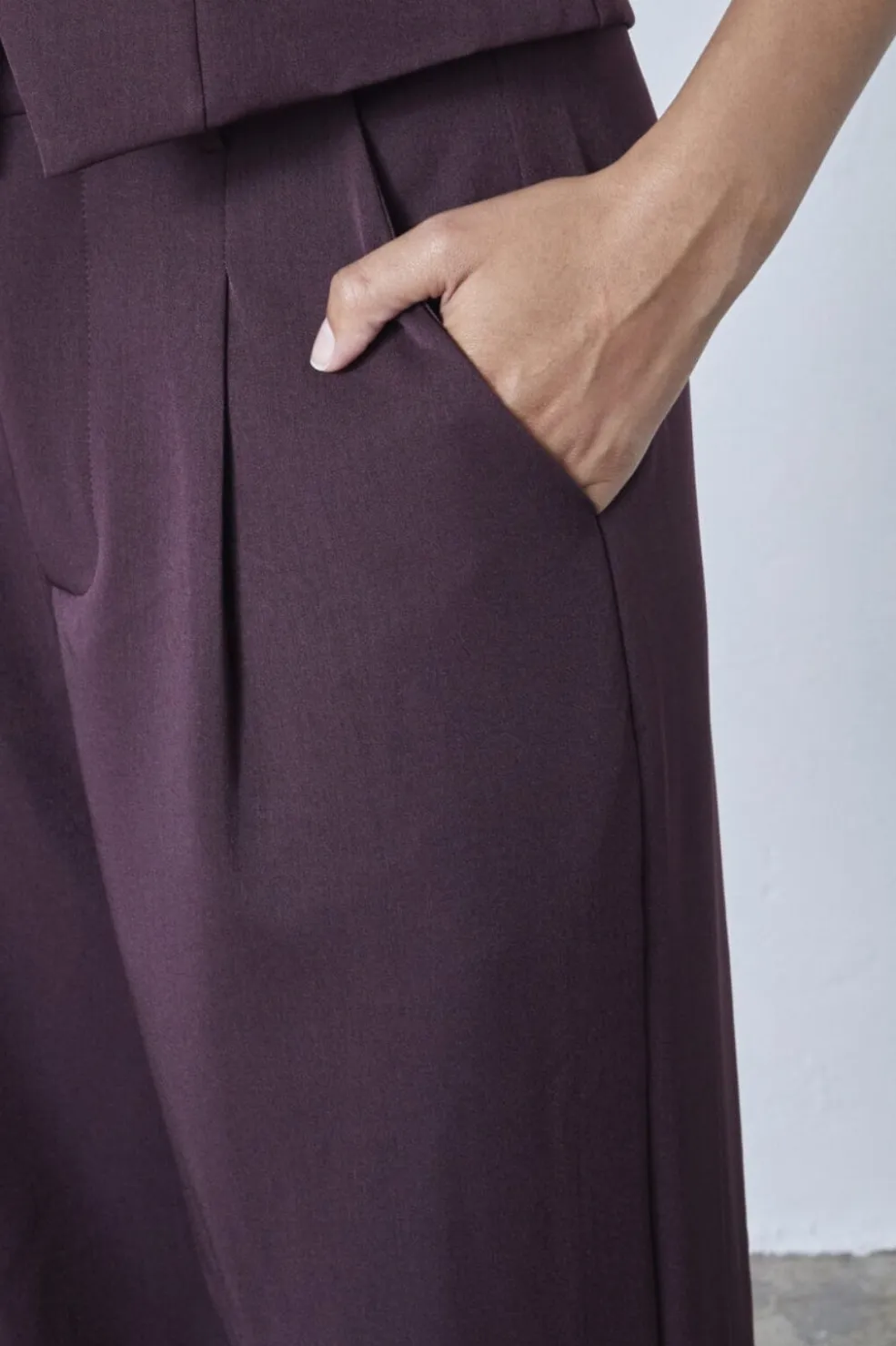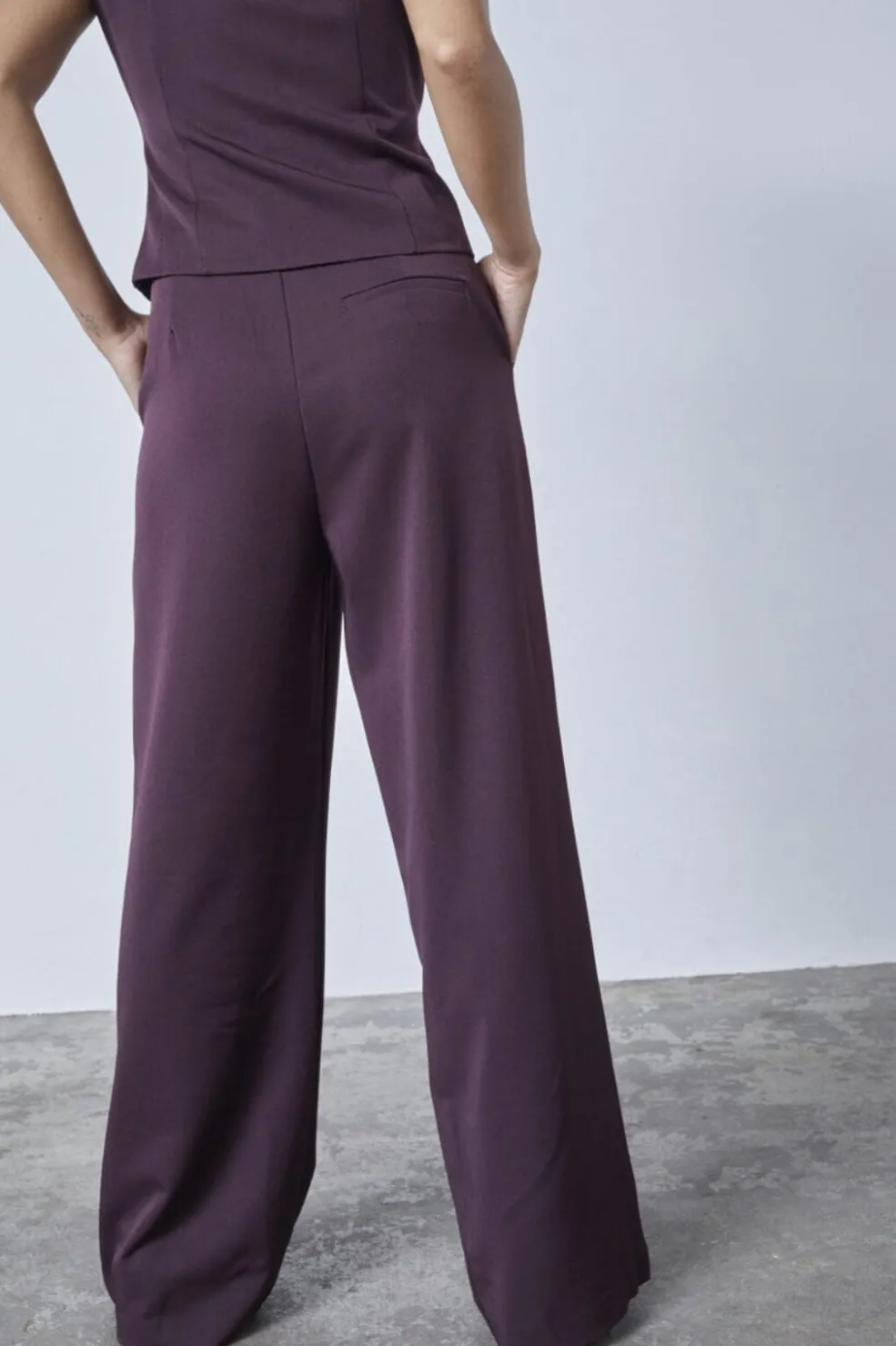 Bukser fra Sisters Point i dyb bordeauxfarve. Bukserne har vide ben og en løs pasform med høj talje.
