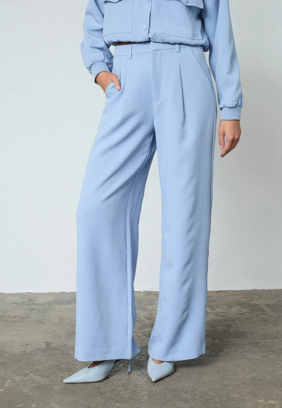 Lyseblå bukser fra Sisters Point med løs pasform og vide ben. Bukserne har en høj talje og gulvlængde.