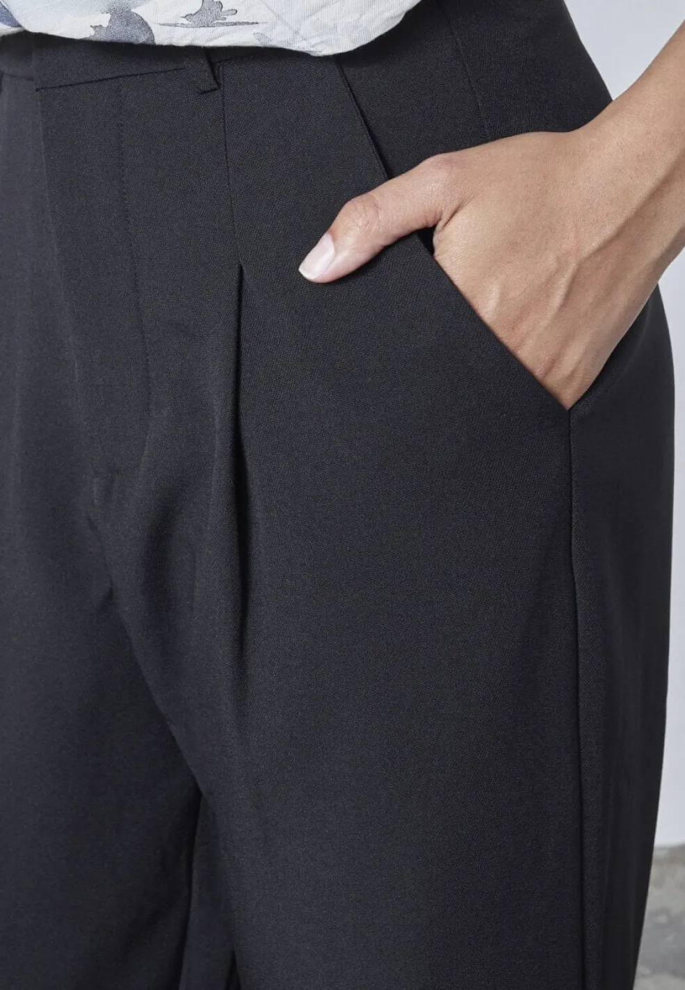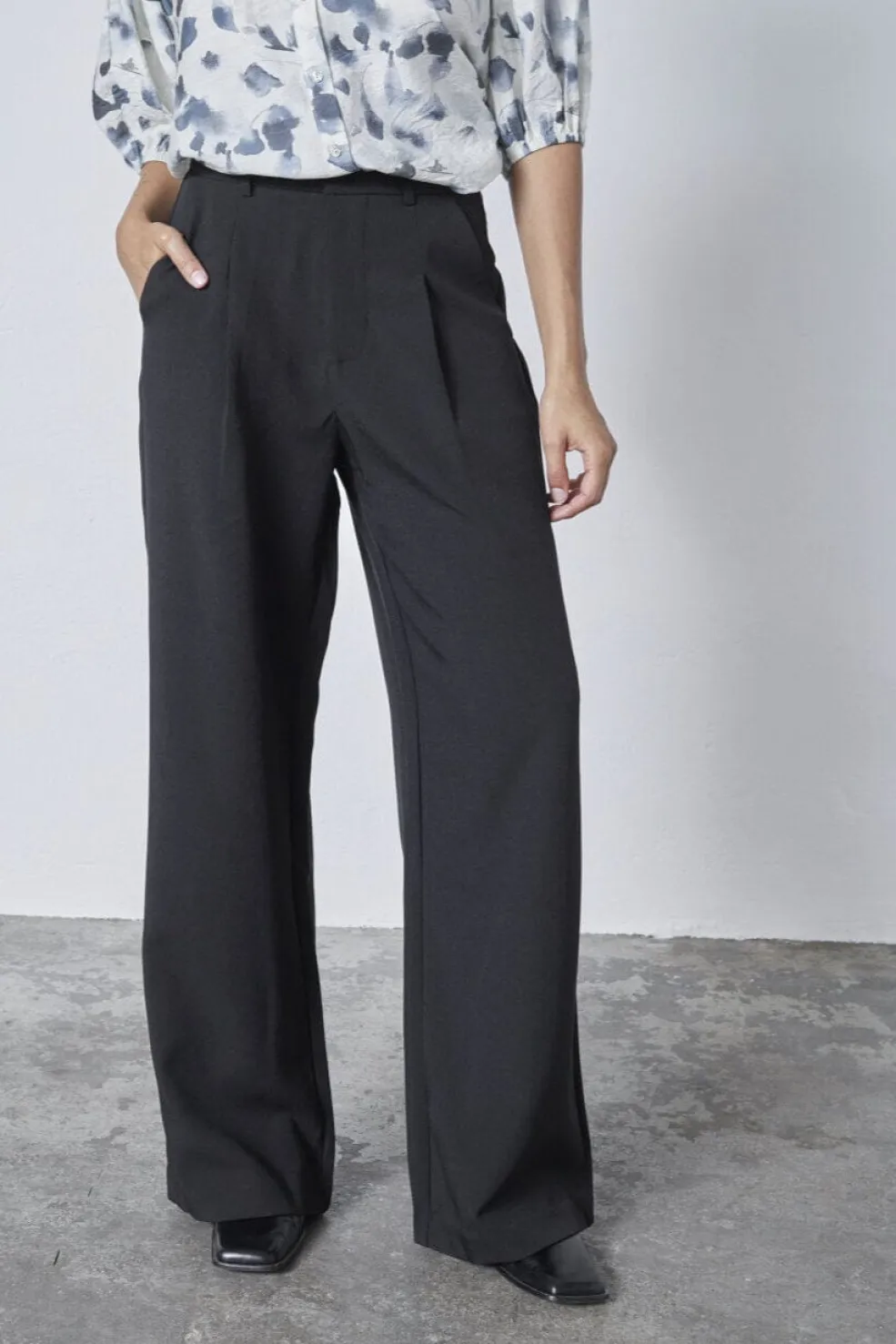 Sorte bukser fra Sisters Point med en løs pasform og lange ben. Bukserne har høj talje og læg foran.