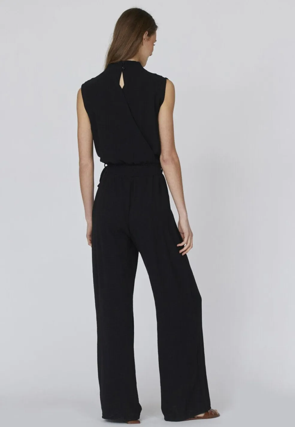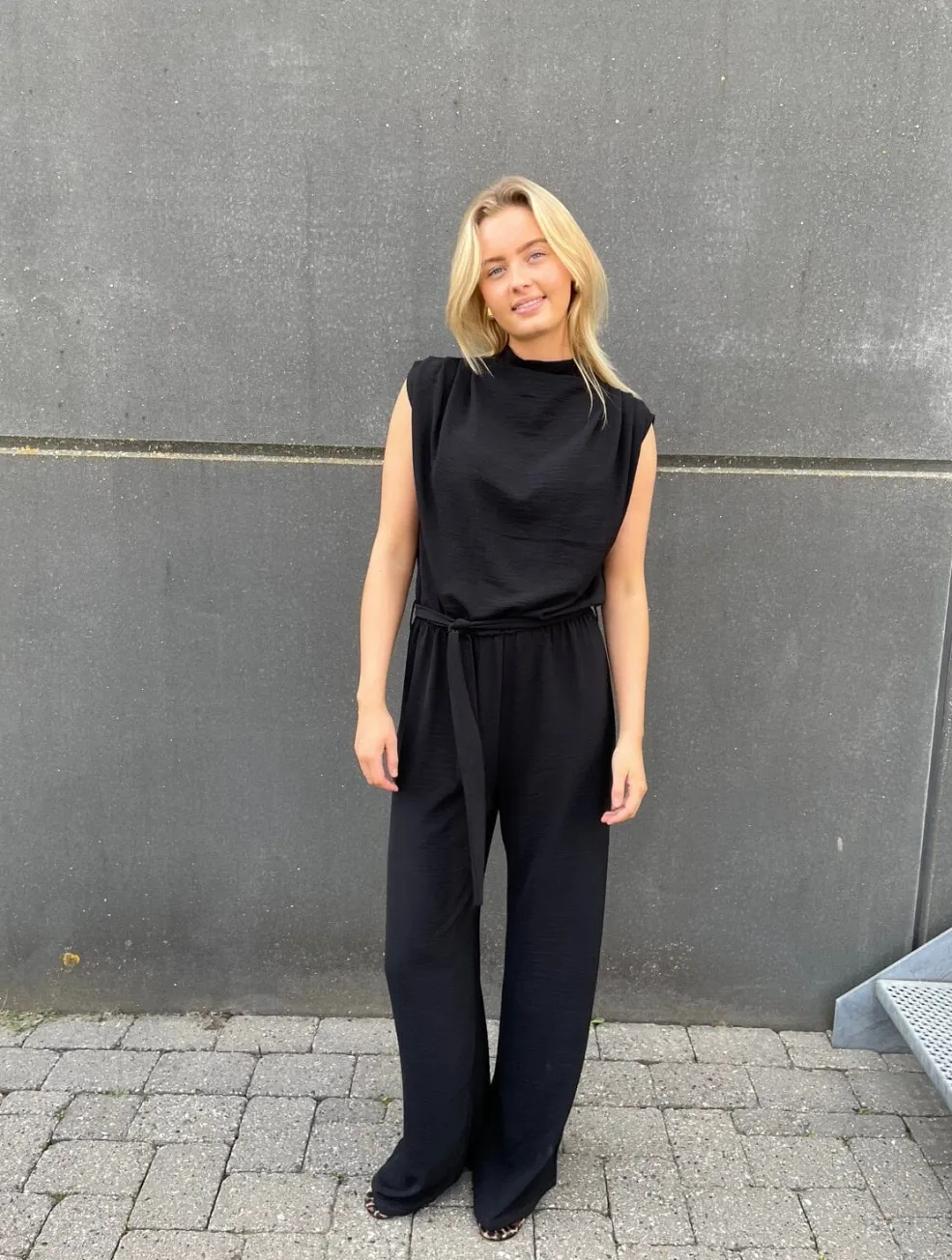 Sort jumpsuit fra Sisters Point med gulvlang længde og høj hals. Buksedragten har et ærmeløst design og bindebånd i taljen, som kan justeres efter ønske.