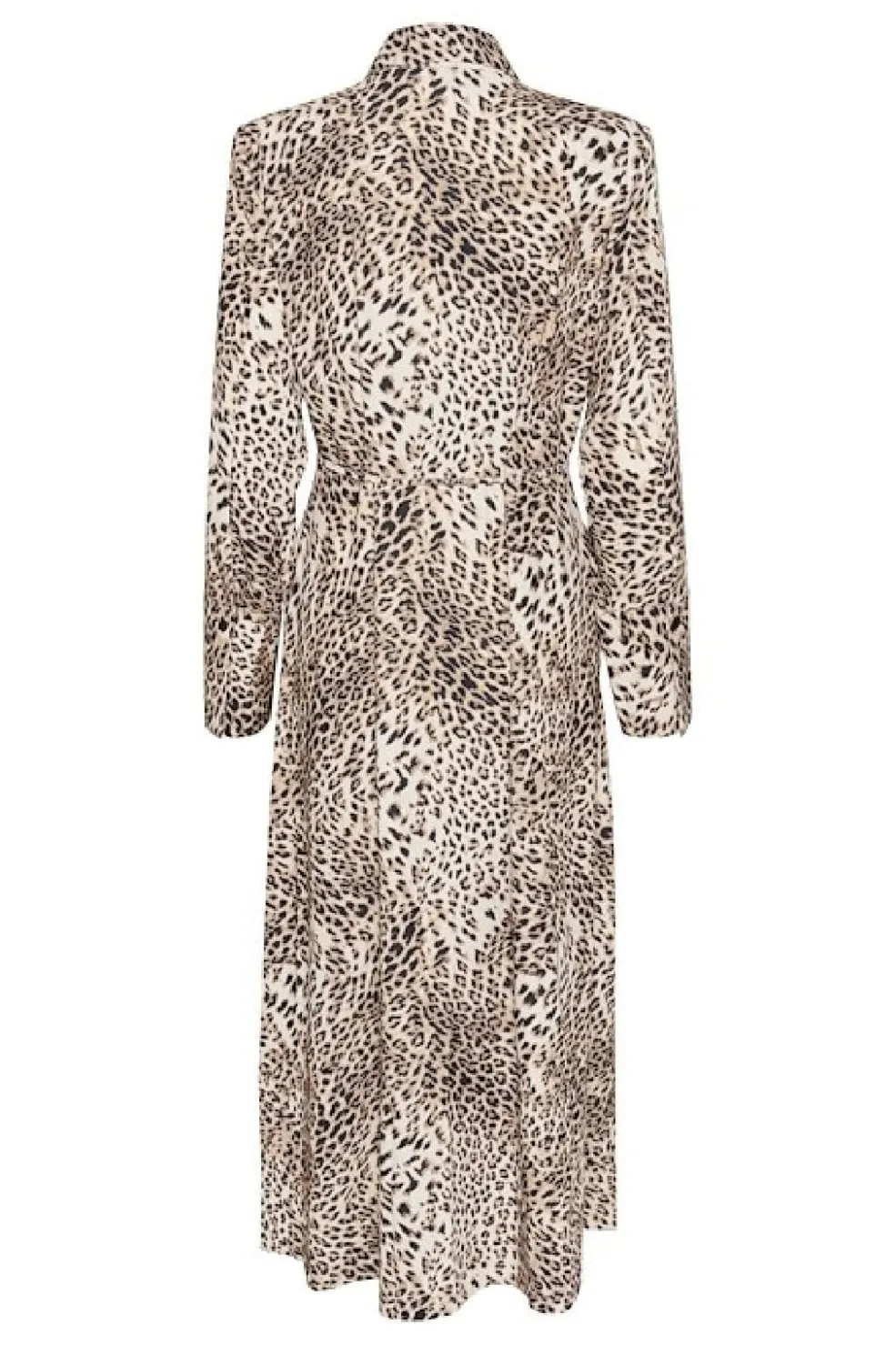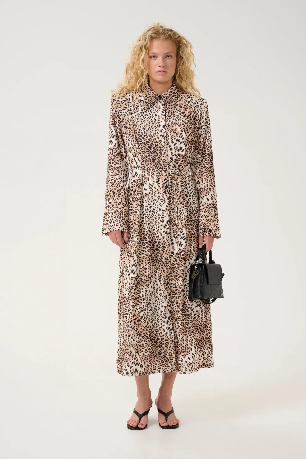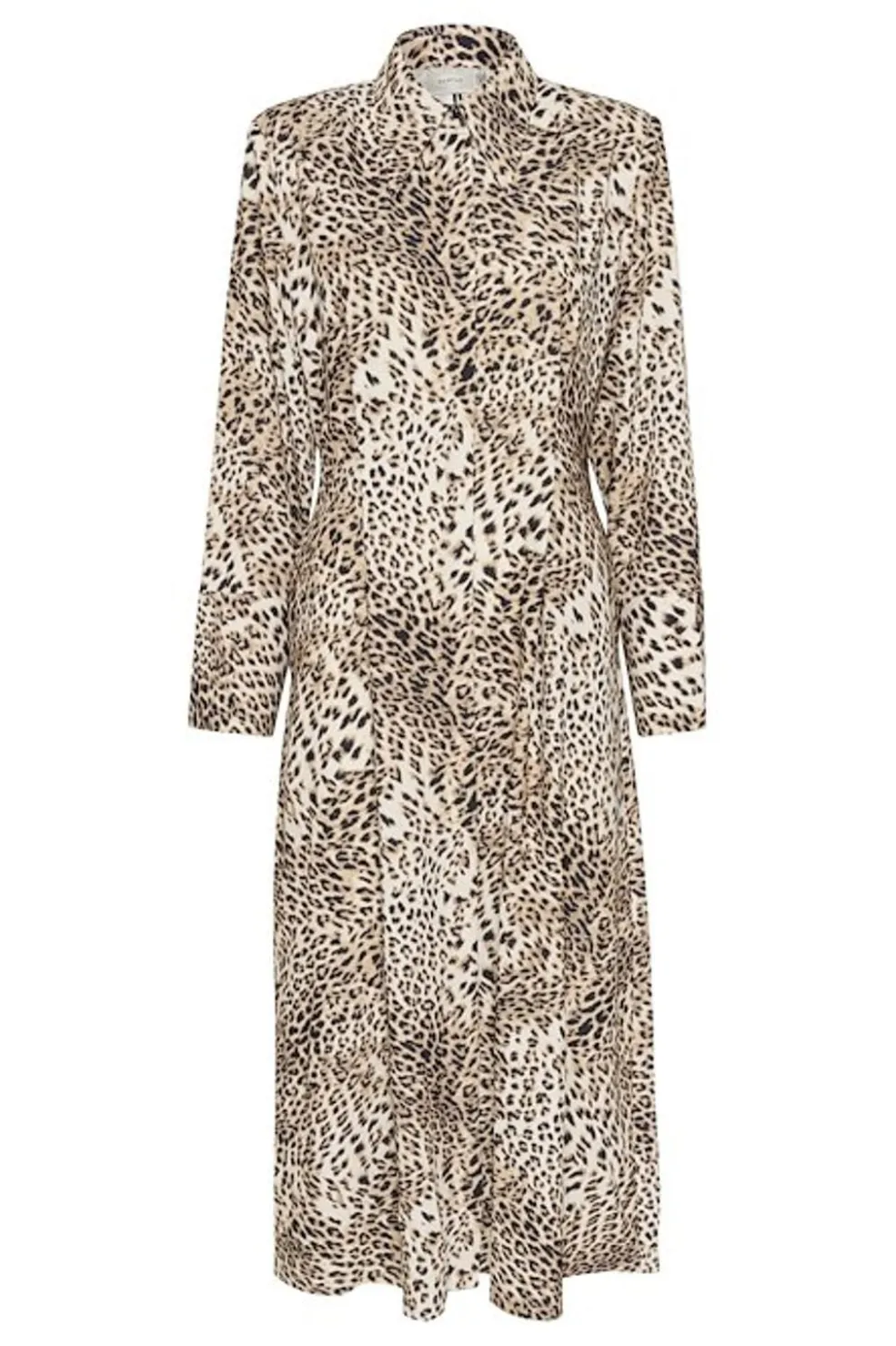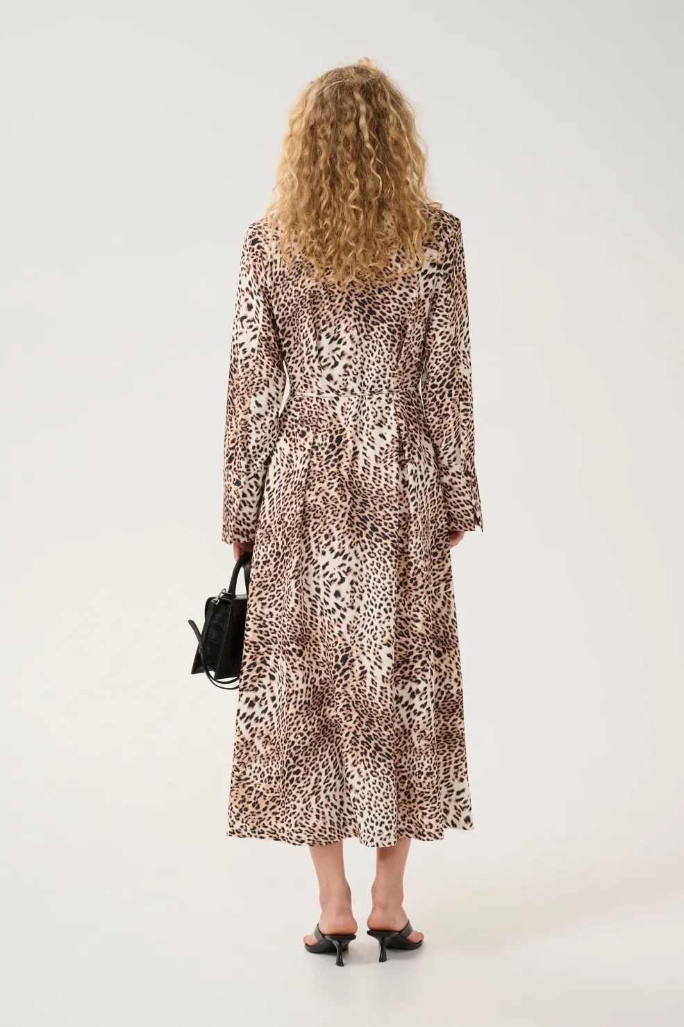 Skjortekjole fra Gestuz med lyst leopardprint. Kjolen har lange ærmer, skjortekrave og knapper foran. Stoffet er lavet af genanvendt polyester med elastan, hvilket giver god bevægelighed.