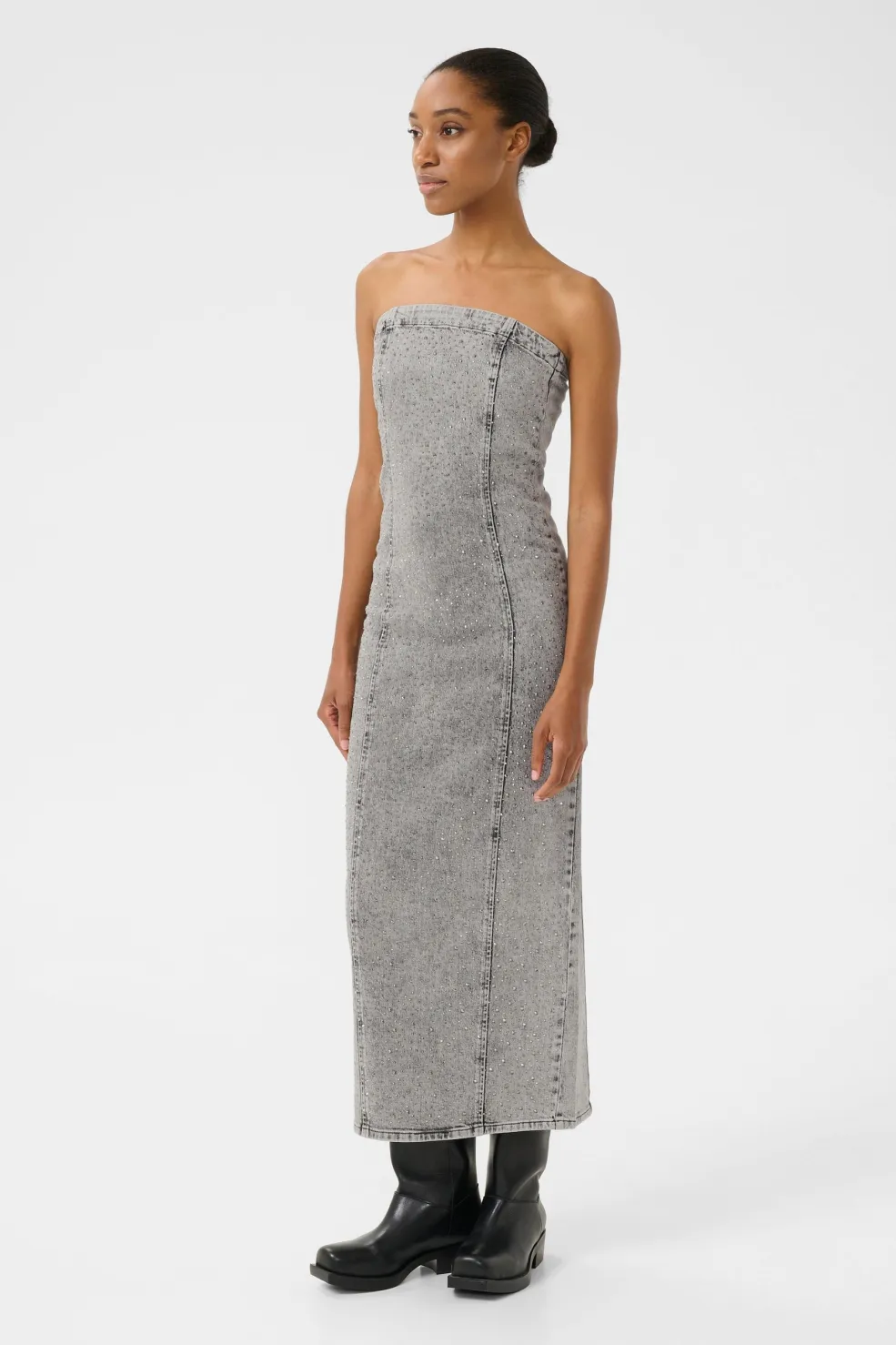 Lang kjole fra Gestuz i vintage grå vask. Kjolen har et stropløst design med off-shoulder udskæring og ankellængde, hvilket giver den et rent og enkelt udtryk.