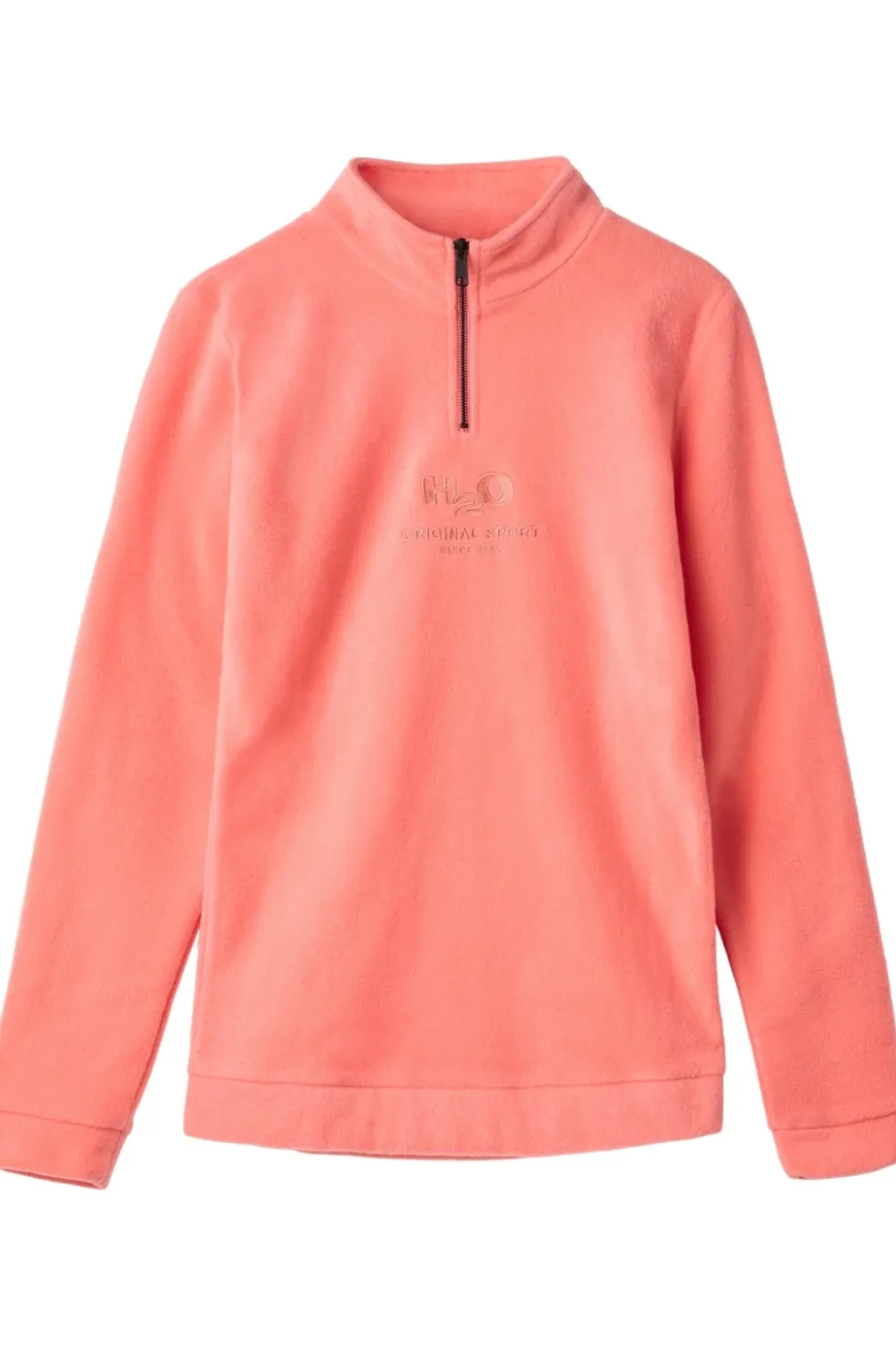 Fleecepullover fra H2O i koralfarve med halv lynlås. Den bløde fleece giver varme og komfort, mens det broderede logo på brystet viser sportsmærkets historie siden 1982.