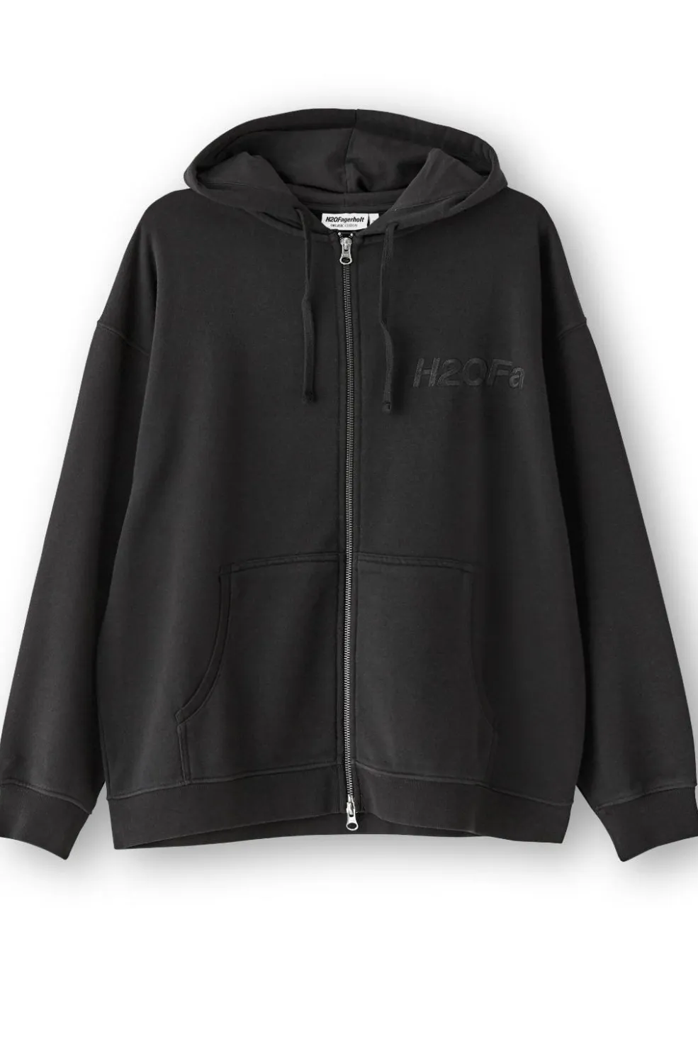 Sort sweatshirt hoodie fra H2O Fagerholt med broderet logo på brystet. Den oversized pasform med sænkede skuldre giver en afslappet silhuet.