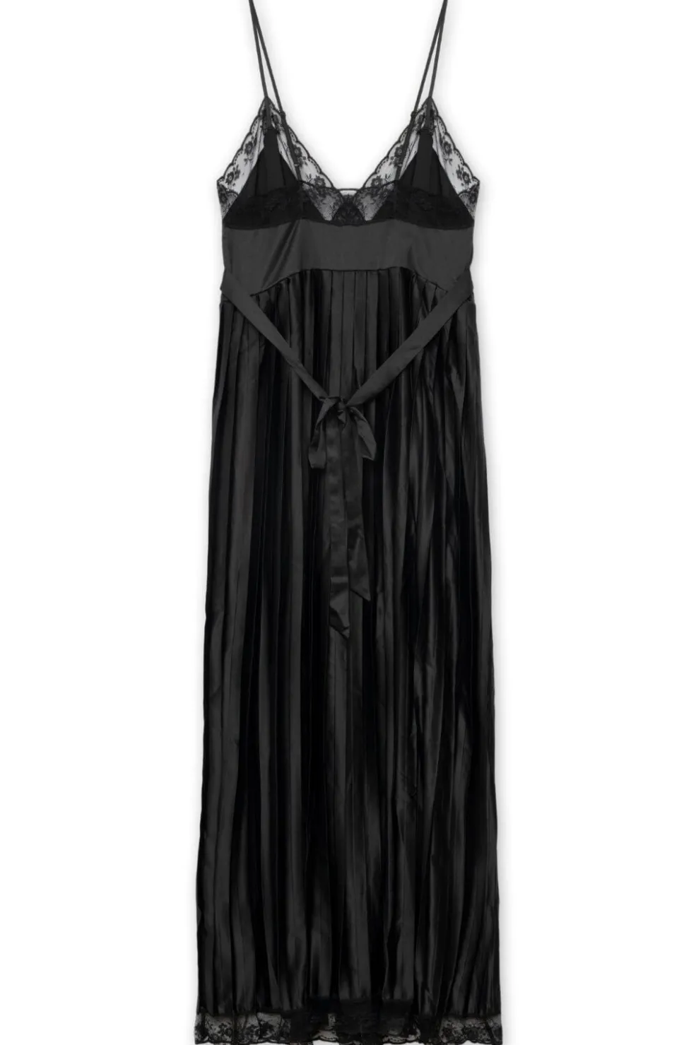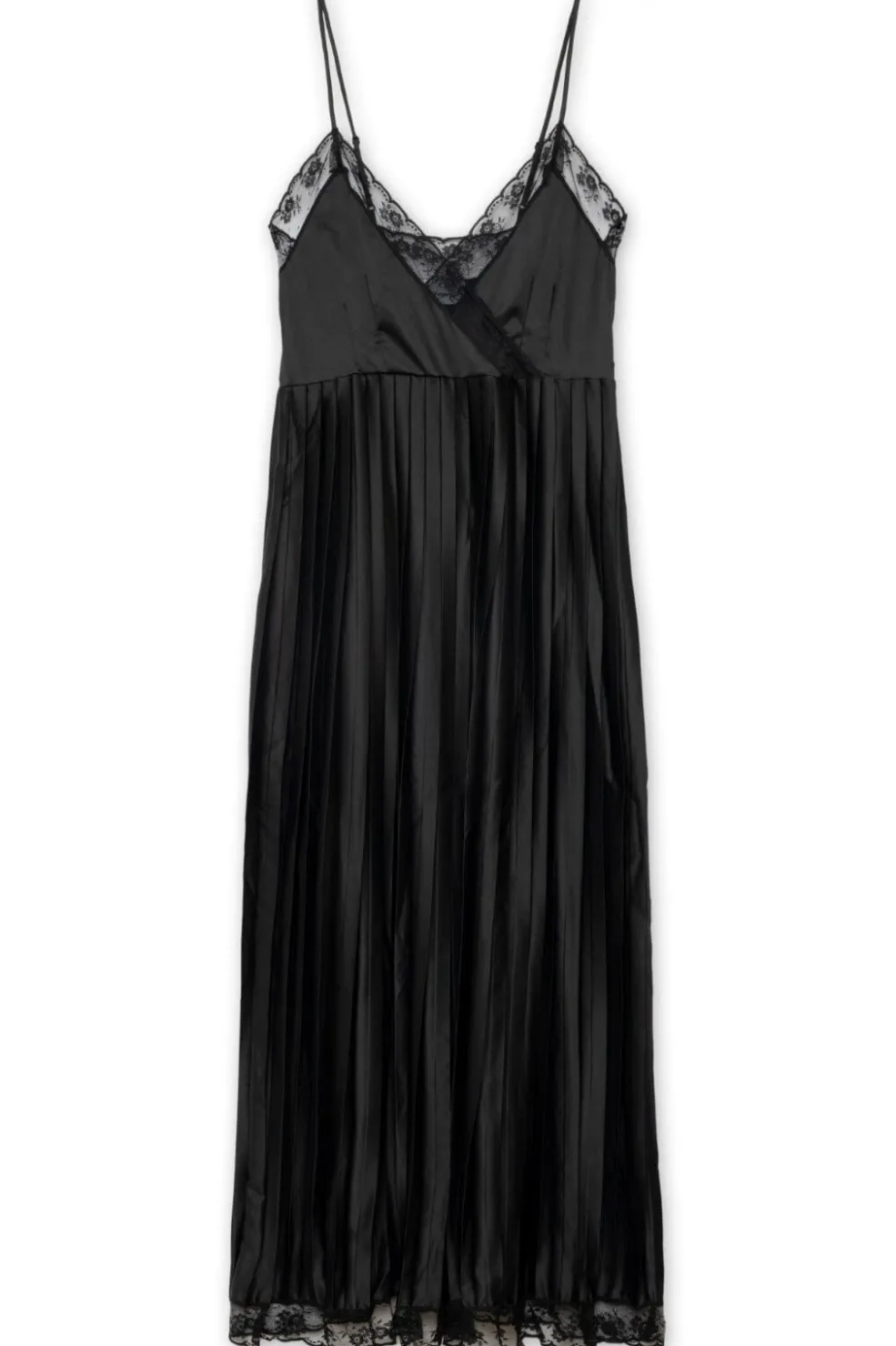 Sort festkjole fra H2O Fagerholt med plisseret design. Kjolen har V-udskæring med blondedetaljer og tynde spaghettistropper.