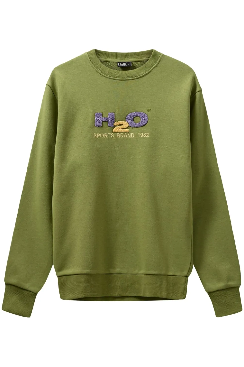 Grøn sweatshirt fra H2O med rund halsudskæring. På brystet sidder logoet i lilla og gul med teksten SPORTS BRAND 1982, hvilket skaber en sporty stil.
