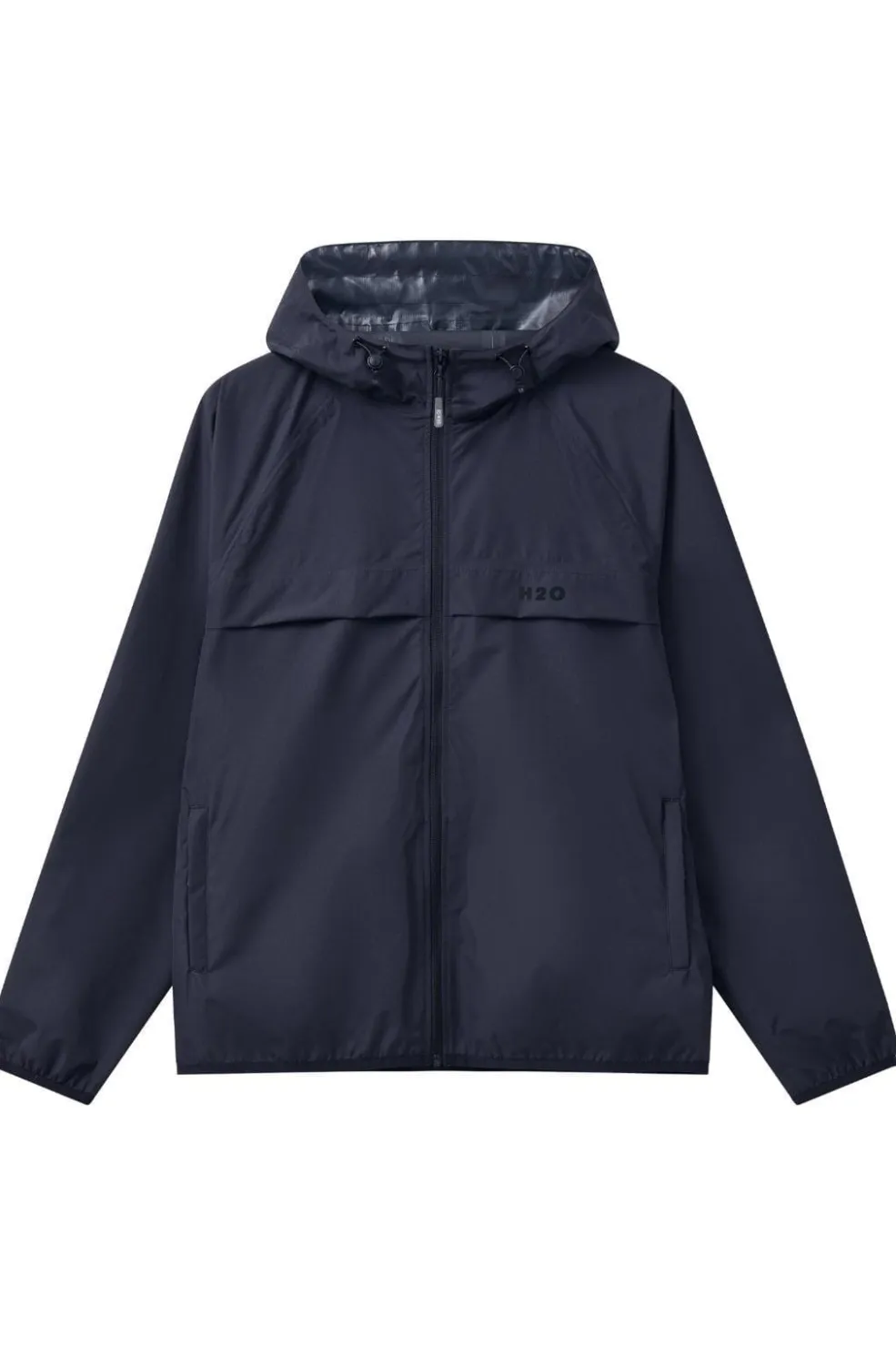 Mørkeblå regnjakke fra H2O i genanvendt polyester ripstop. Jakken har tapede sømme og en praktisk, pakbar konstruktion til rejser og udendørs aktiviteter.