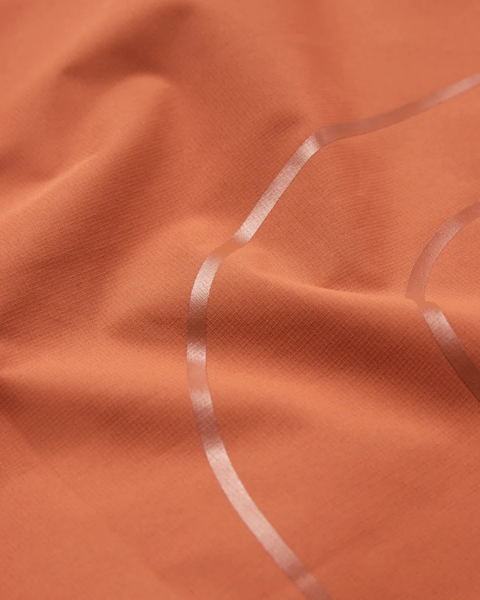Lang regnjakke fra H2O i en orange-brun efterårsfarve. Jakken har en vandtæthed på 3000 mm og en åndbarhed på 800 g/m²/24 timer, som beskytter mod regn.