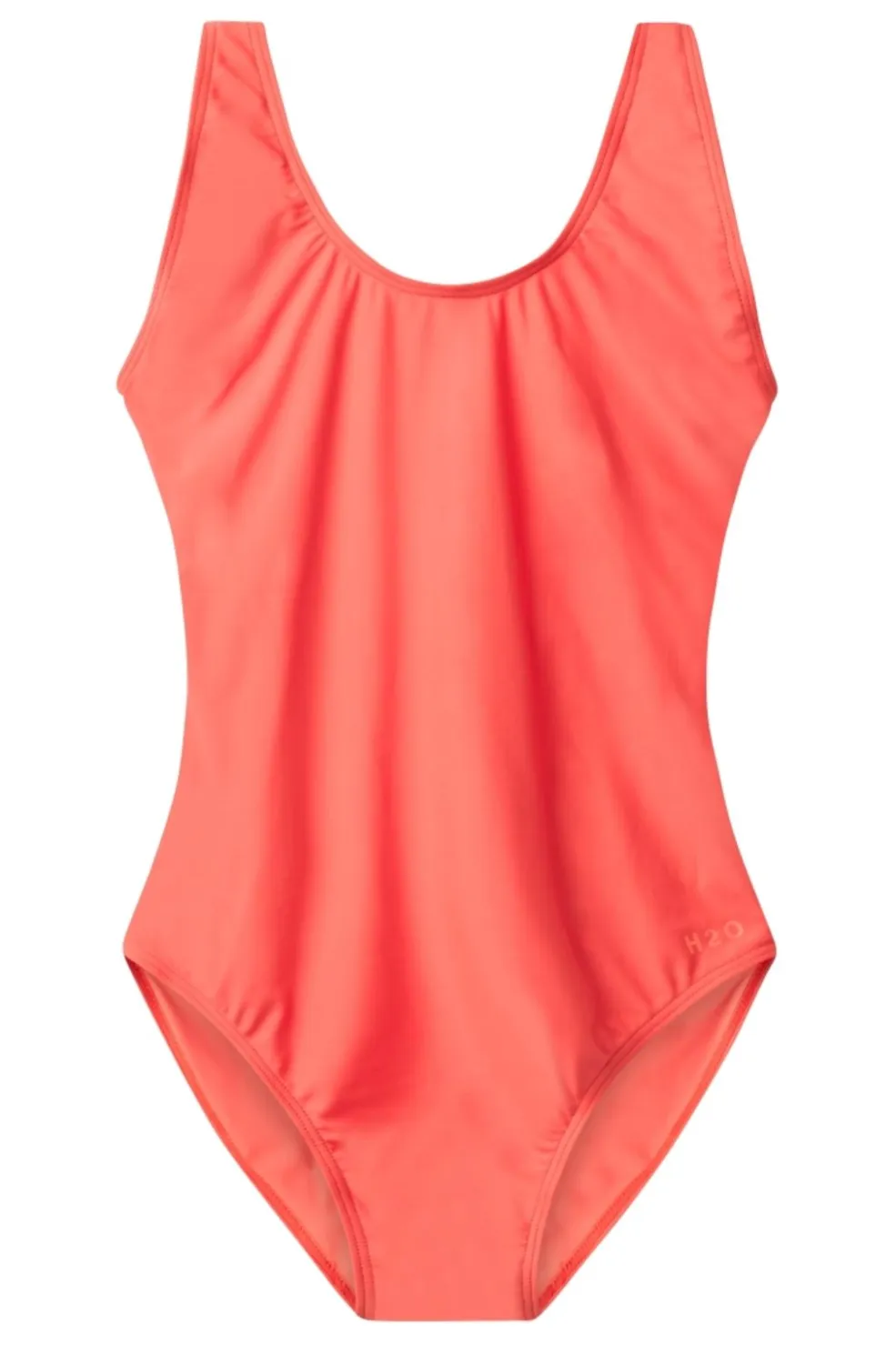 Badedragt fra H2O i en lys orange farve. Den har en rund halsudskæring og en dyb udskæring i ryggen. Materialet giver ekstra støtte omkring brystet.
